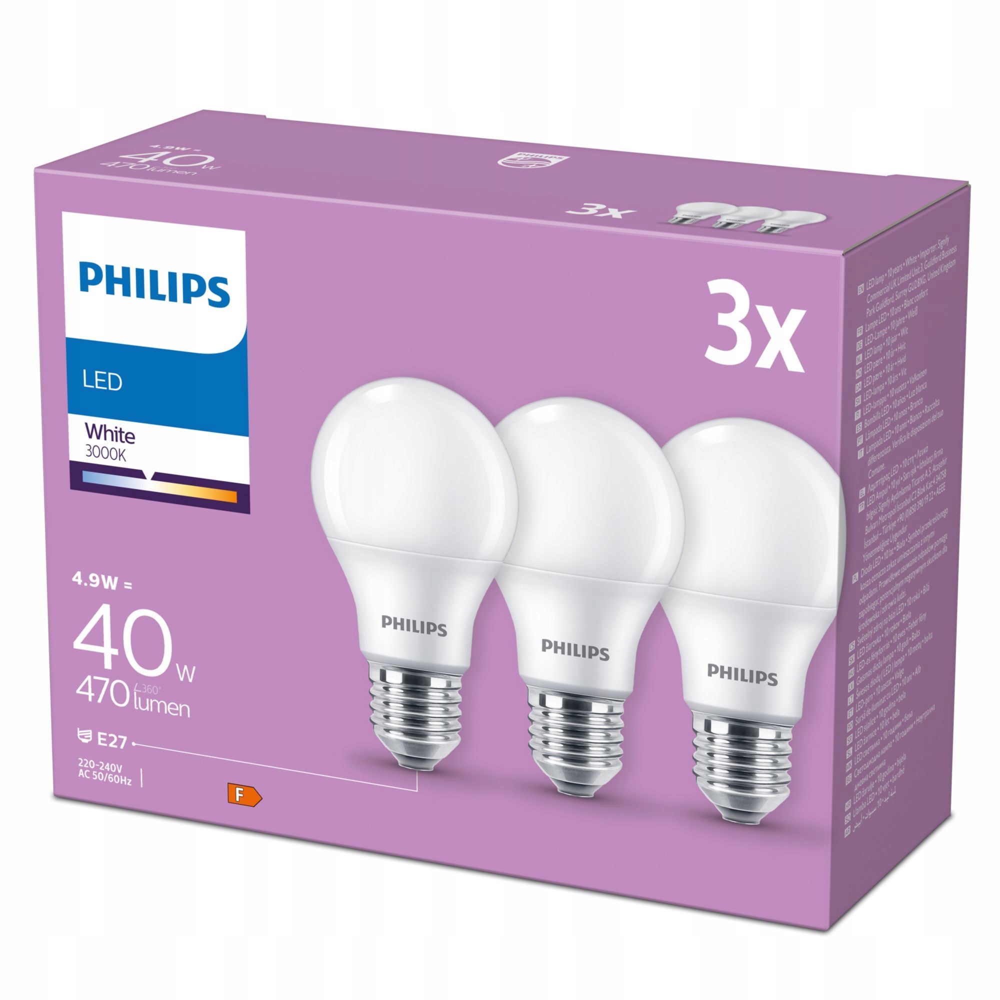 Philips 8719514473737. Lampy: 4,9 W, Ekwiwalent moc żarówki: 40 W, Lampa reflektorowa: E27, Strumień świetlny: 470 lm, Żywotność żarówki: 10000 h, Kolor światła: Biały, Temperatura koloru: 3000 K, Kąt wiązki: 180°, Współczynnik oddawania barw (CRI): 80, Współczynnik mocy: 0,53