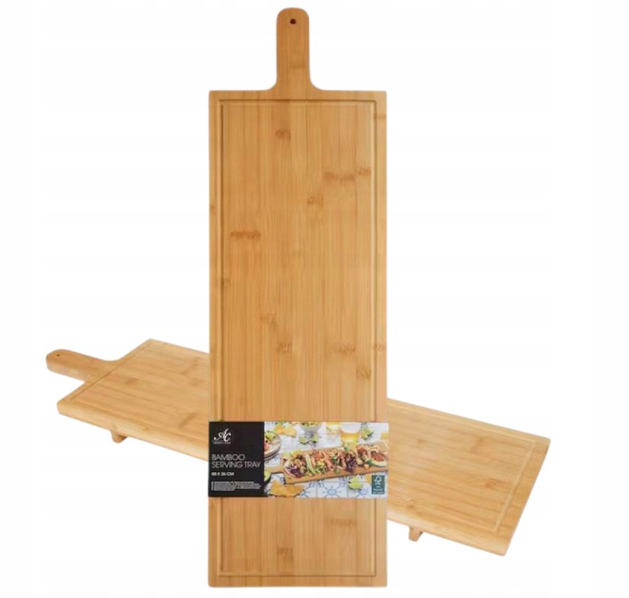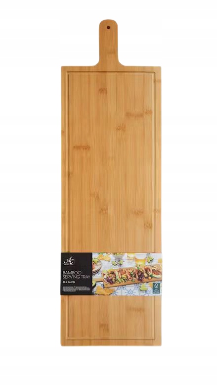 Bambusowa deska do krojenia z pokrywą o wymiarach 88 x 26 cm posiada bardzo wytrzymałą powierzchnię , odporną na głębokie zarysowania i na pęknięcia. Specjalne wgłębienie zapobiega wylewaniu się soków z warzyw , owoców i mięsa. Pokrywa chroni potrawy przed wyschnięciem. Idealnie nadaje się do serwowania potraw i przekąsek. Popularność bambusowego wyposażenia kuchni nie bierze się znikąd. Roślina ta jest ceniona na całym świecie niezależnie od branży ze względu na szereg różnych właściwości. W pierwszej kolejności warto wspomnieć o właściwościach mechanicznych: drewno bambusowe cechuje się bardzo wysoką twardością (nie rysując przy tym innych powierzchni) będąc jednocześnie materiałem lekkim. Ponadto zachowuje wysoką odporność na wilgoć – co stanowi ogromną zaletę przy kontakcie z żywnością oraz codziennej eksploatacji. Kolejnym aspektem jest jego ekologiczność – będąc tworzywem naturalnym i biodegradowalnym stanowi doskonałą alternatywę dla produktów plastikowych.