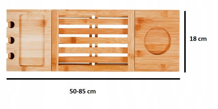 Uniwersalna rozsuwana Bambusowa Półka na wannę o wymiarach: 50-85 x 18cm (długość / szerokość).