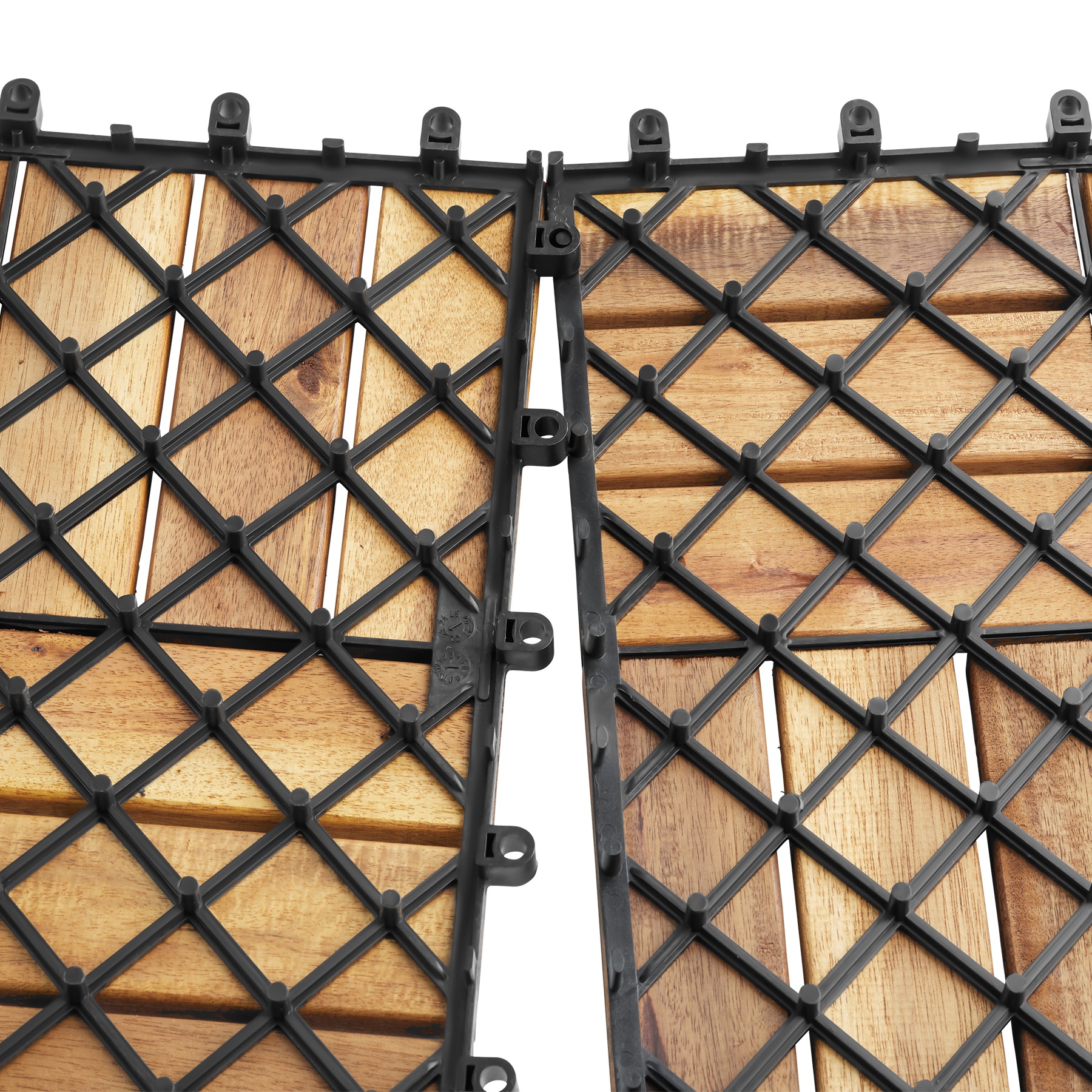 Dzięki przyjaznemu dla użytkownika systemowi klikania możesz szybko i łatwo ułożyć płytki - bez potrzeby używania narzędzi lub specjalnych umiejętności stolarskich. Solidne listwy drewniane są umieszczone na stabilnej siatce, która dzięki swojej funkcji drenażowej umożliwia odpływ, zapobiegając gromadzeniu się wody.