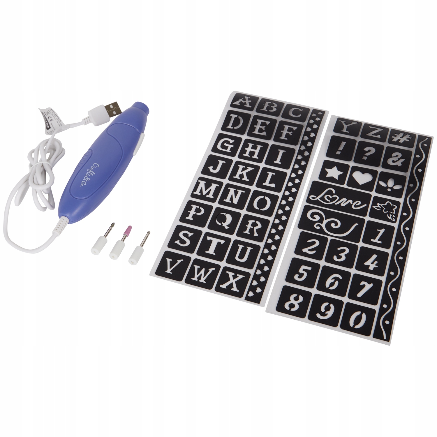 Natychmiastowe rozpoczęcie pracy możliwe jest poprzez zawarcie w zestawie 2 praktycznych szablonów i 3 końcówek do grawerowania z literami, cyframi oraz użytecznymi i dekoracyjnymi symbolami.