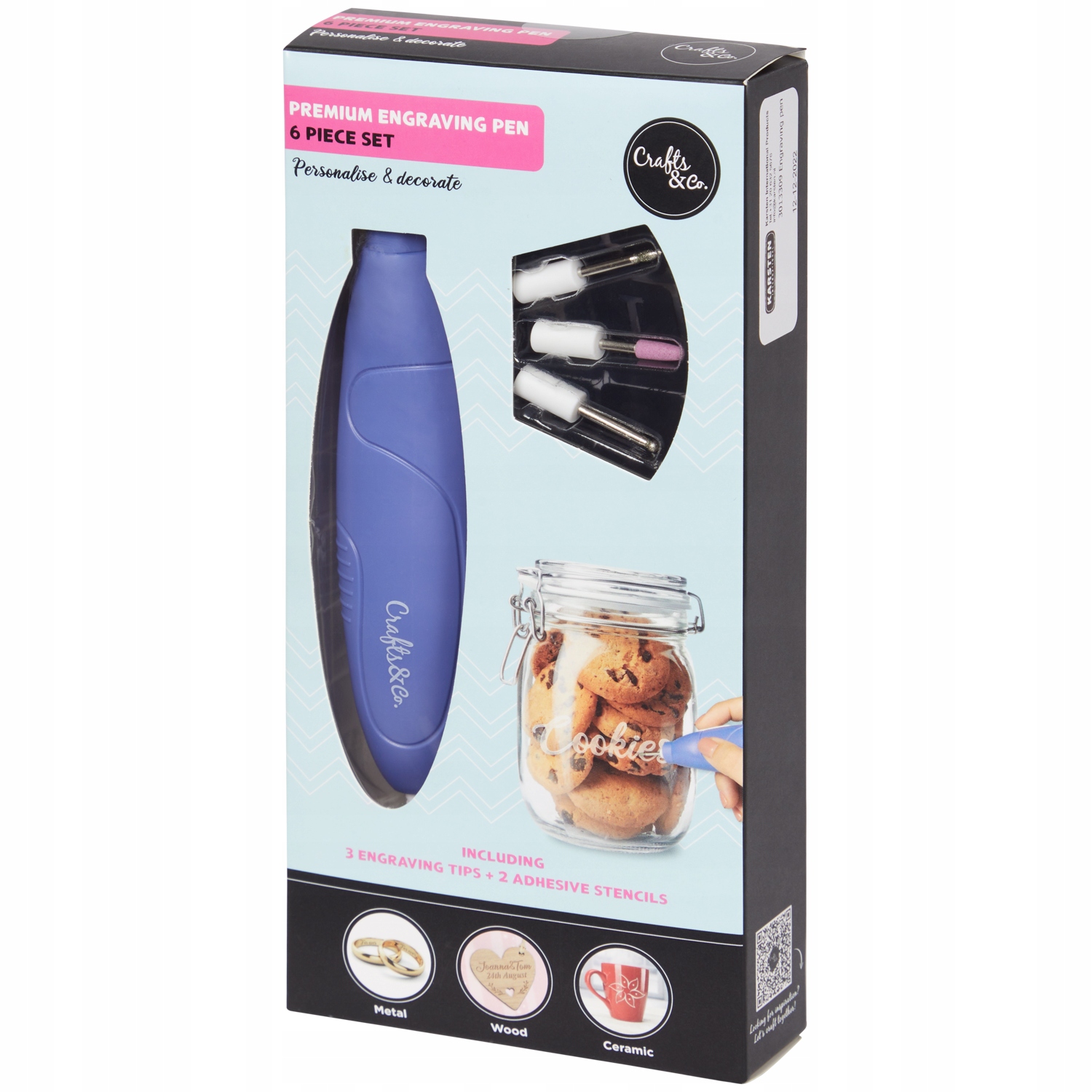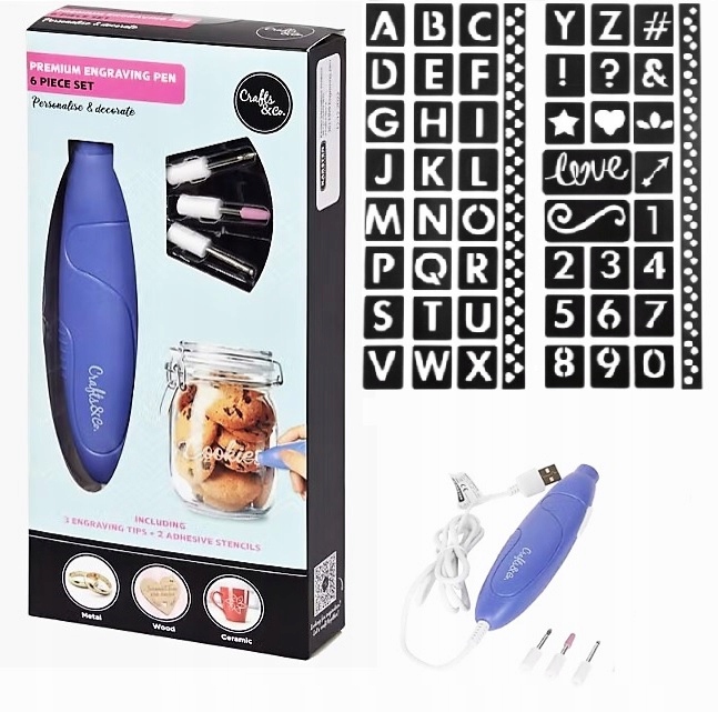 Odkryj wielofunkcyjny długopis do grawerowania Crafts & Co z 3 końcówkami i 2 samoprzylepnymi szablonami, który pozwoli Ci na personalizację i dekorację drewna, ceramiki i metalu.