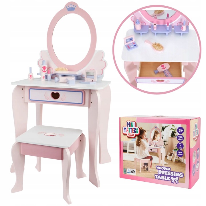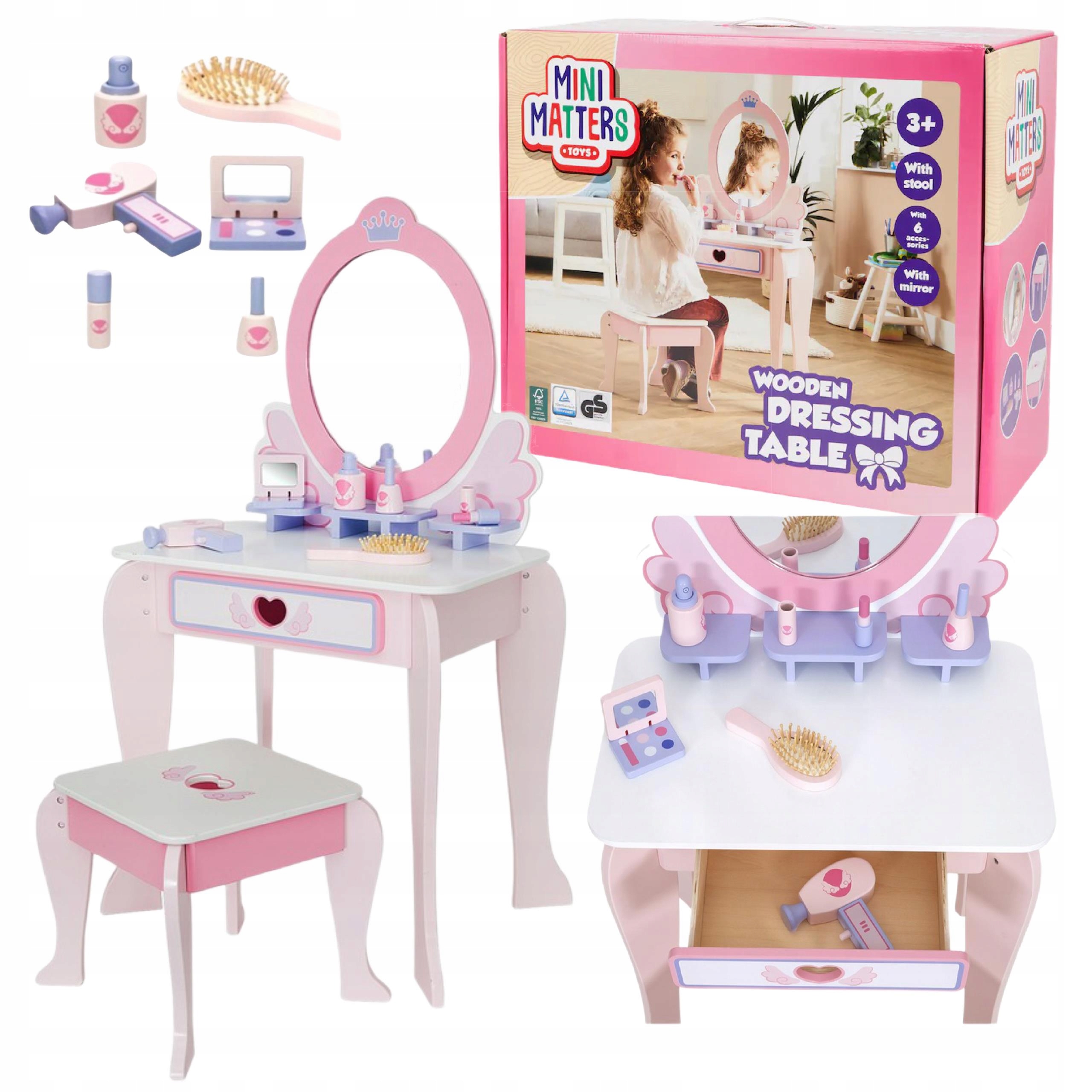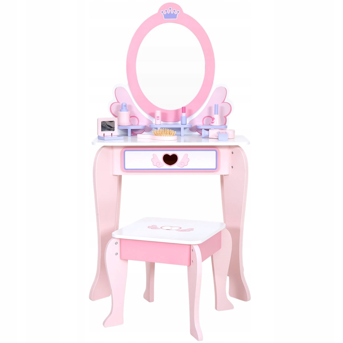 - Wielofunkcyjna Toaletka: Ta drewniana toaletka posiada lusterko i taboret, co czyni ją idealnym miejscem do zabawy w makijaż. Twoja córka może usiąść wygodnie na taborecie i malować się, korzystając z lusterka.