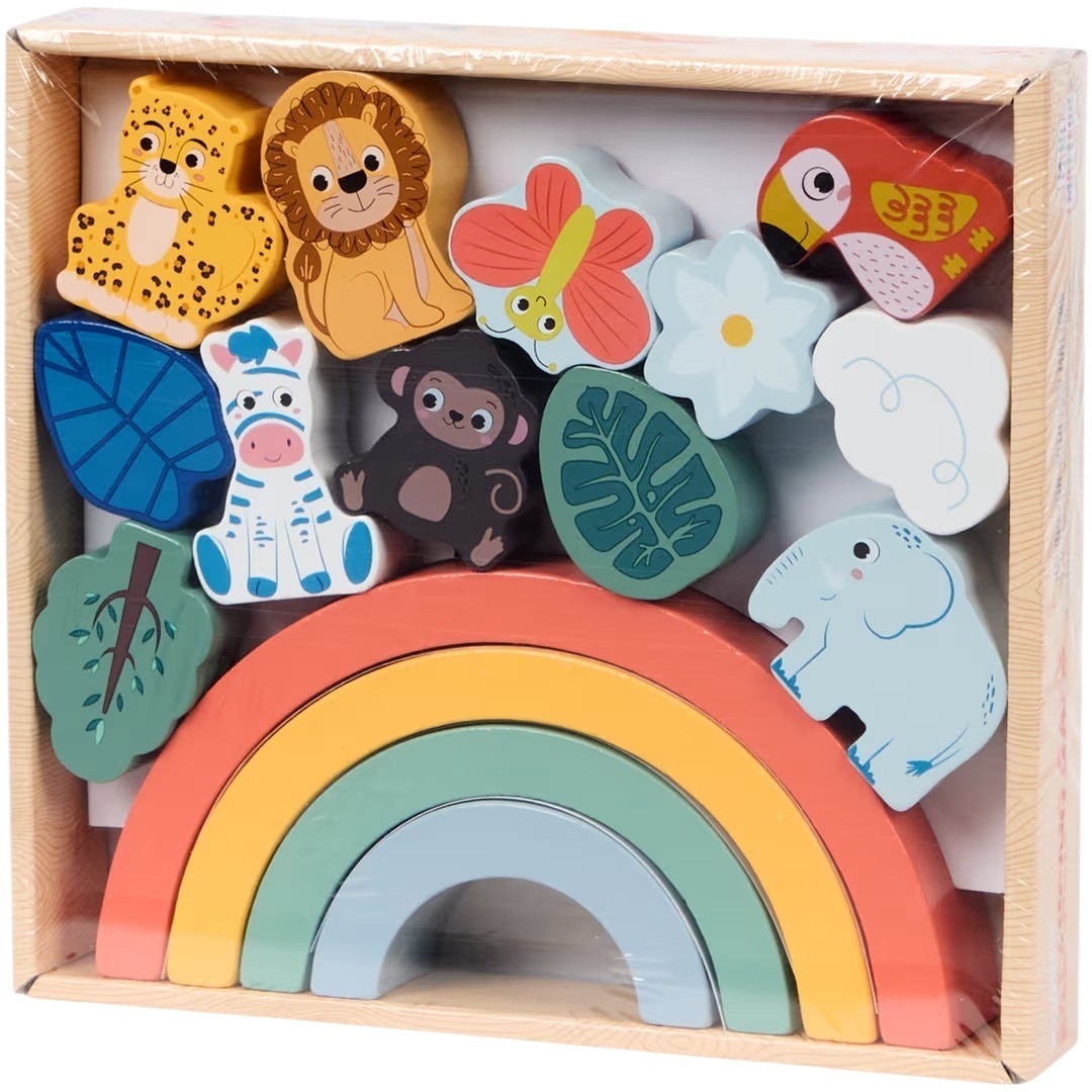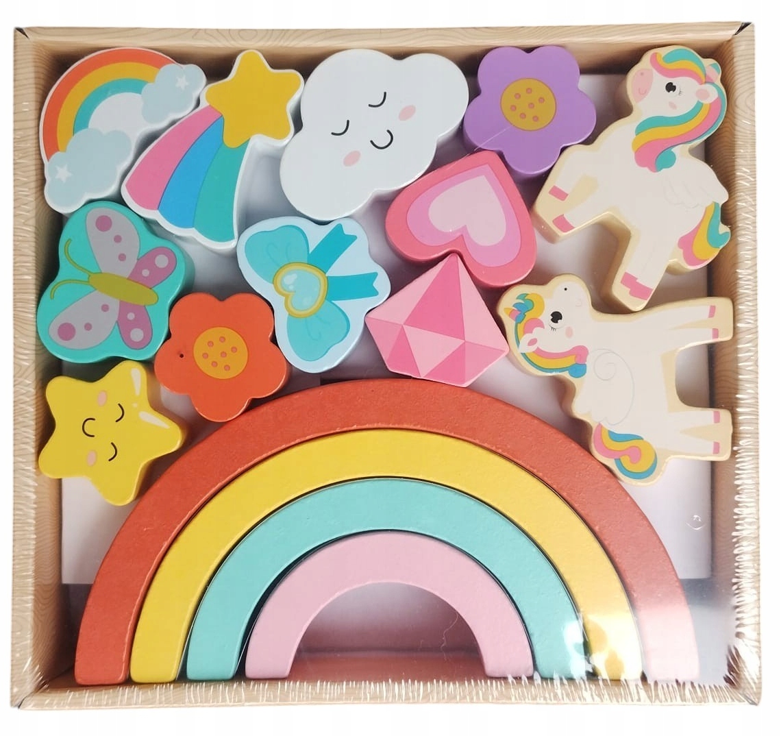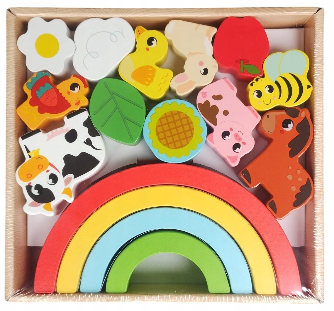 Pozwól dziecku uczyć się poprzez zabawę dzięki wesołej drewnianej grze na równowagę w kształcie kolorowej tęczy! Ułóż zwierzęta na bujającej się tęczy i postaraj się zachować równowagę.