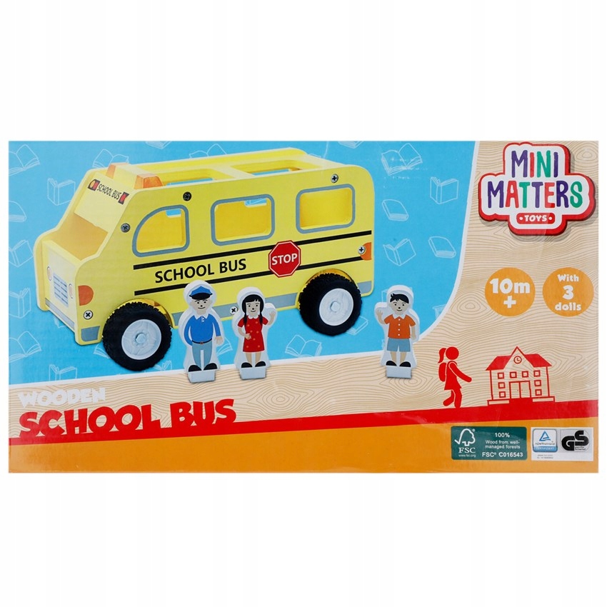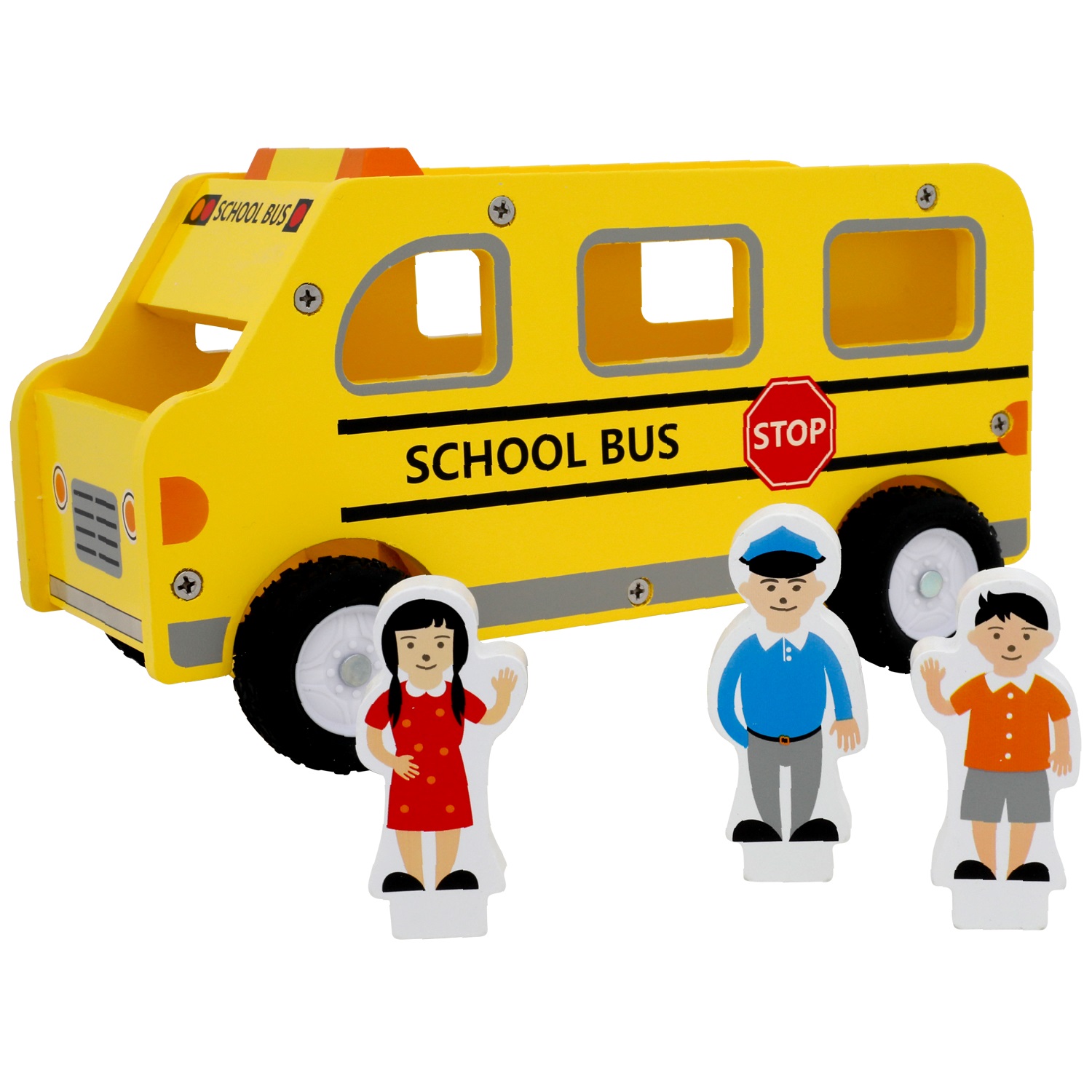 Wieloczęściowy zestaw do zabawy z pojazdem i figurkami kierowcy, uczennicy i ucznia.