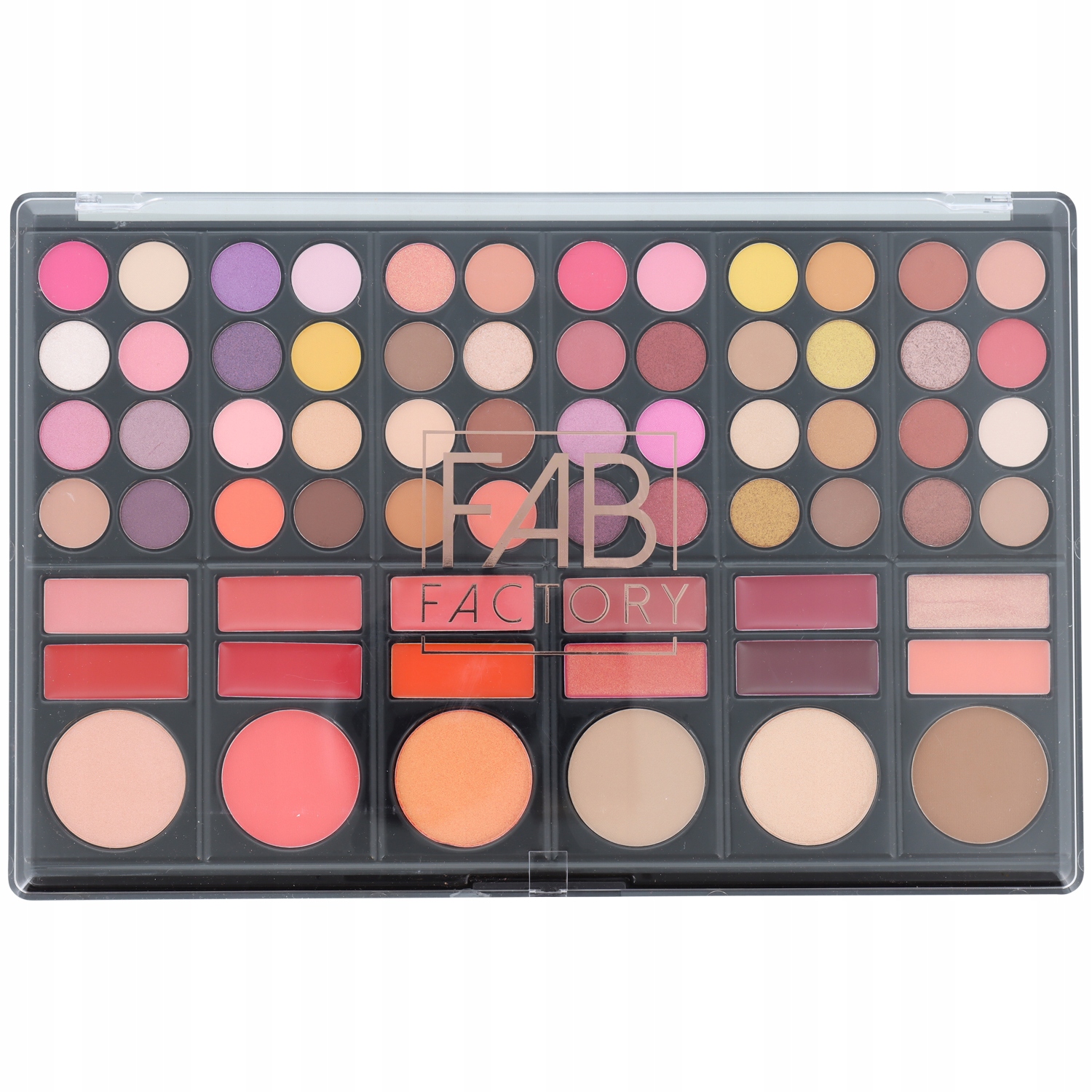 Paleta FAB FACTORY to świetny sposób na stworzenie porywającej stylizacji. Dzięki niej mamy pod ręką wszystko, co potrzebne do kompletnego makijażu. W zestawie otrzymamy trwałe i bezpieczne dla skóry kosmetyki - 48 cieni do powiek i 12 szminek, ale także 3 odcienie puderu i 3 różu.
