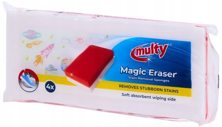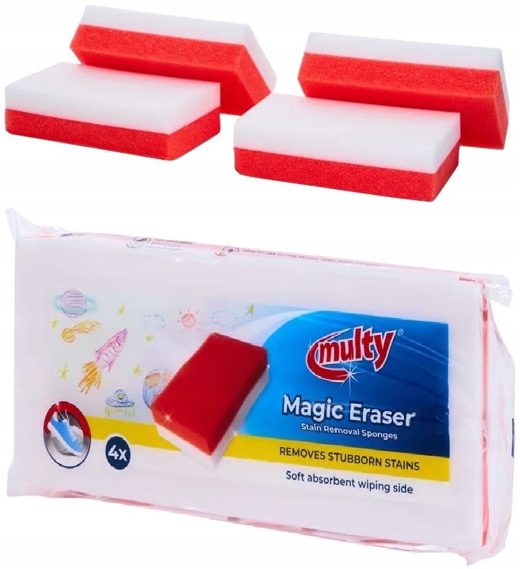 Gąbki Multy Magic Eraser sprawiają, że uporczywe plamy znikają, jakby nigdy ich nie było, i to bez użycia detergentów. Po prostu przy użyciu samej wody. Idealny produkt do płytek, luster, butów, a nawet klawiatury. Ułatw sobie życie dzięki mocy tej magicznej gąbki.
