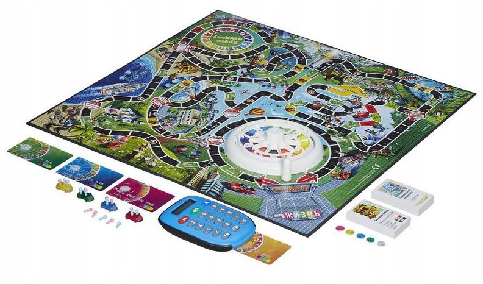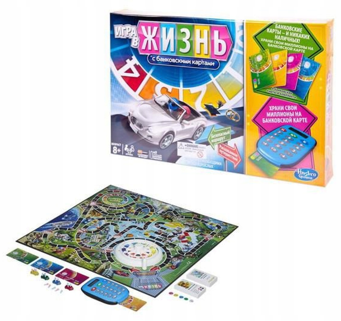 Настільна гра - гра в життя з банківськими картками Класична гра життя та вибору заводу, яка отримує абсолютно новий електронний вигляд. Вибір за вами: вступати до коледжу, університету чи робити все можливе, щоб досягти професійного успіху. Встановіть гру на стовп, використовуючи вертушку, міст, будівлі та гори. Роздайте фішки, розділіть карти на стопки. Потім ви повинні вибрати банкіра і статуетку ігрового автомата для кожного гравця. Крути рулетку та виконуй завдання, пересуваючись по дошці. Дані та оплата здійснюється на банківську картку. Виграйте найбагатшого гравця.