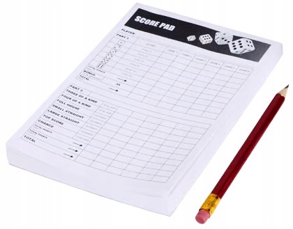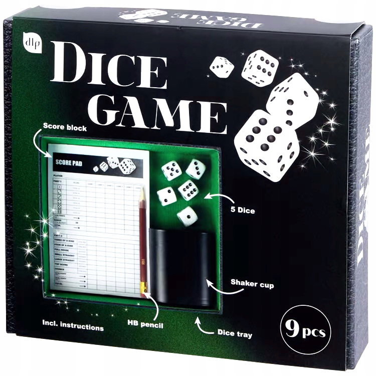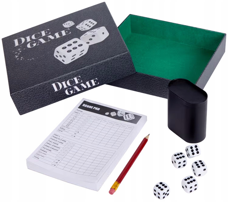 ✅ Kompletny zestaw – W pudełku znajduje się wszystko, co potrzebne: kości, kubek do rzucania, blok do zapisywania punktów i ołówek.