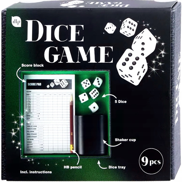 9-elementowy zestaw – Zestaw zawiera 5 kości do gry, ołówek oraz blok do zapisywania punktów z 100 arkuszami.