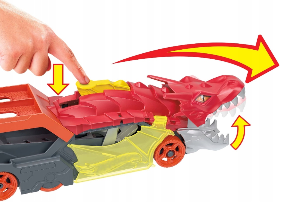 Dzięki specjalnemu mechanizmowi, który uruchamia się podczas popychania transportera, smok chwyta samochód w szczęki i "połyka", aby przechować go w brzuchu. Chcesz wyładować pojazdy? Wystarczy opuścić rampę z tyłu transportera.
