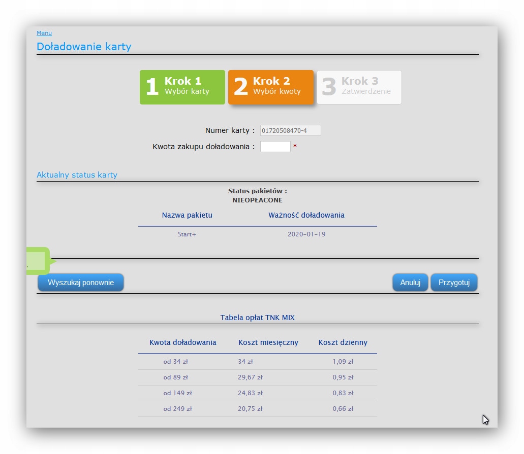 Poniżej zrzut z ekranu doładowań z widocznym cennikiem.