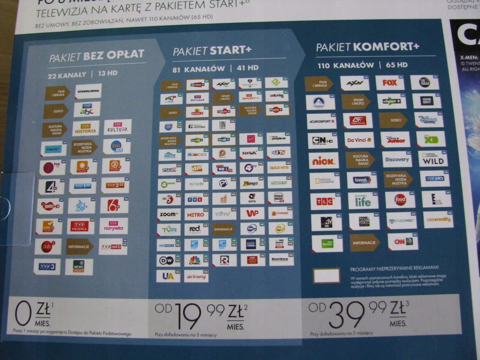 Kartę wystarczy sobie doładować na pakiet start hd na 1 miesiąc lub ile się chce, a potem po zakończonym doładowaniu ma się jeszcze następny miesiąc pakietu bez opłat hd (25 kanałów w tym 12 HD)