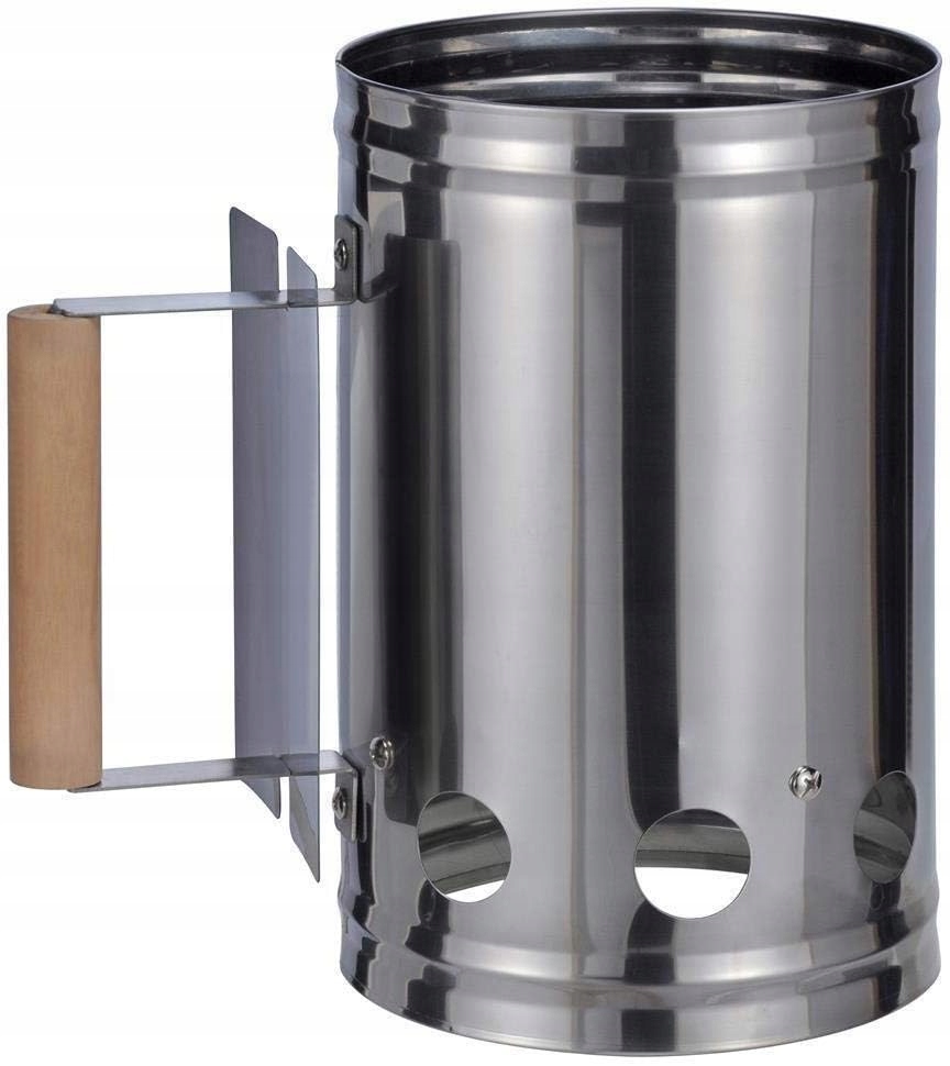 Rozpałka do węgla do grilla, kolor srebrny, ok. 17 x 26,8 x 27,4 cm, okrągły, korpus ze stali i uchwyt z drewna.