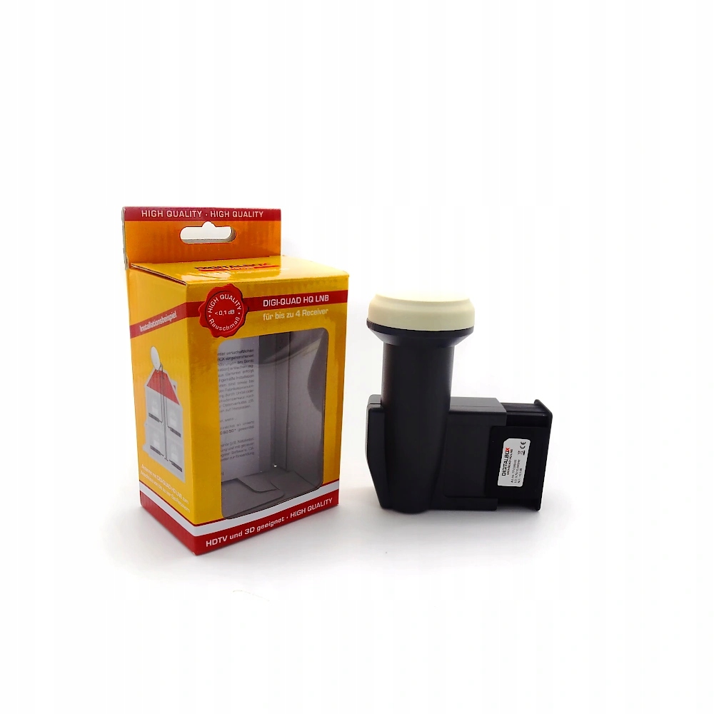 Wysokiej jakości konwerter LNB wysokiej jakości („HQ”) w stylowym, czarnym wzornictwie, o wyjątkowych właściwościach odbioru i współczynniku szumów poniżej 0,1 dB. Głowica odbiornika zgodna z technologią cyfrową nadaje się do dostarczania sygnału telewizyjnego i radiowego czterem abonentom za pośrednictwem satelity. Konwerter LNB można łączyć ze wszystkimi popularnymi antenami satelitarnymi z uchwytem 40 mm.