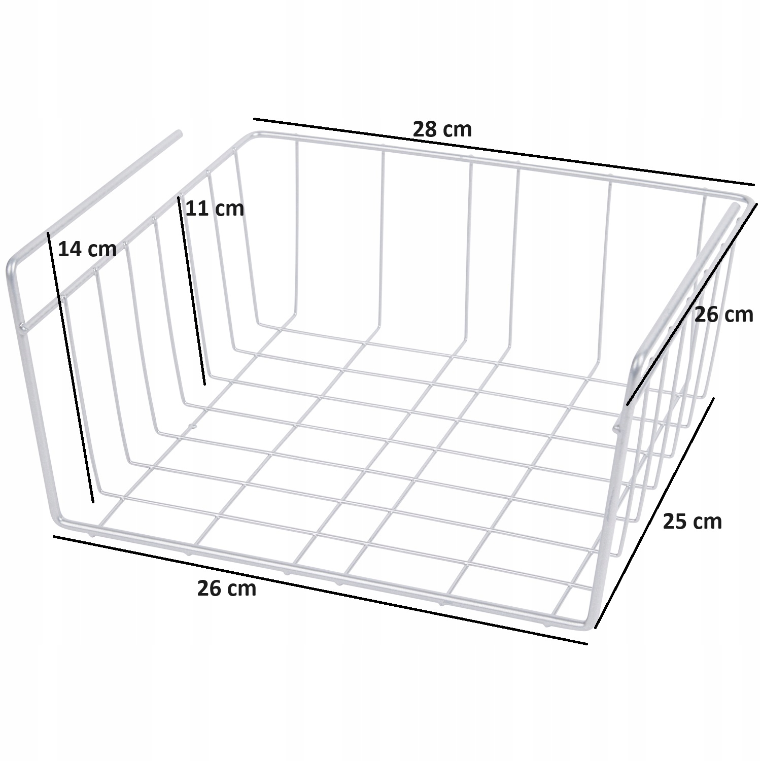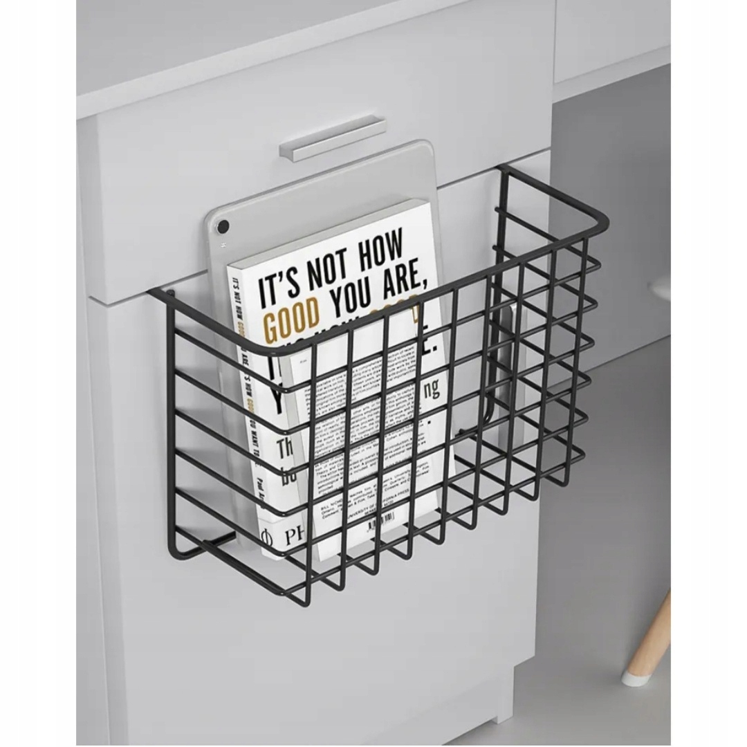 Koszyk jest stworzony, aby ułatwiać ci życie, dzięki specjalnym uchwytom możesz powiesić go na półce. Jest wykonany z jedynie ze srebrnej, metalowej kratki, powoduje to, że jest on bardzo prosty ale i pasuje do wielu wnętrz. Jest idealny do wnętrz w stylu industrial. Jego wymiary wnoszą 30 cm x 26 cm x 14 cm