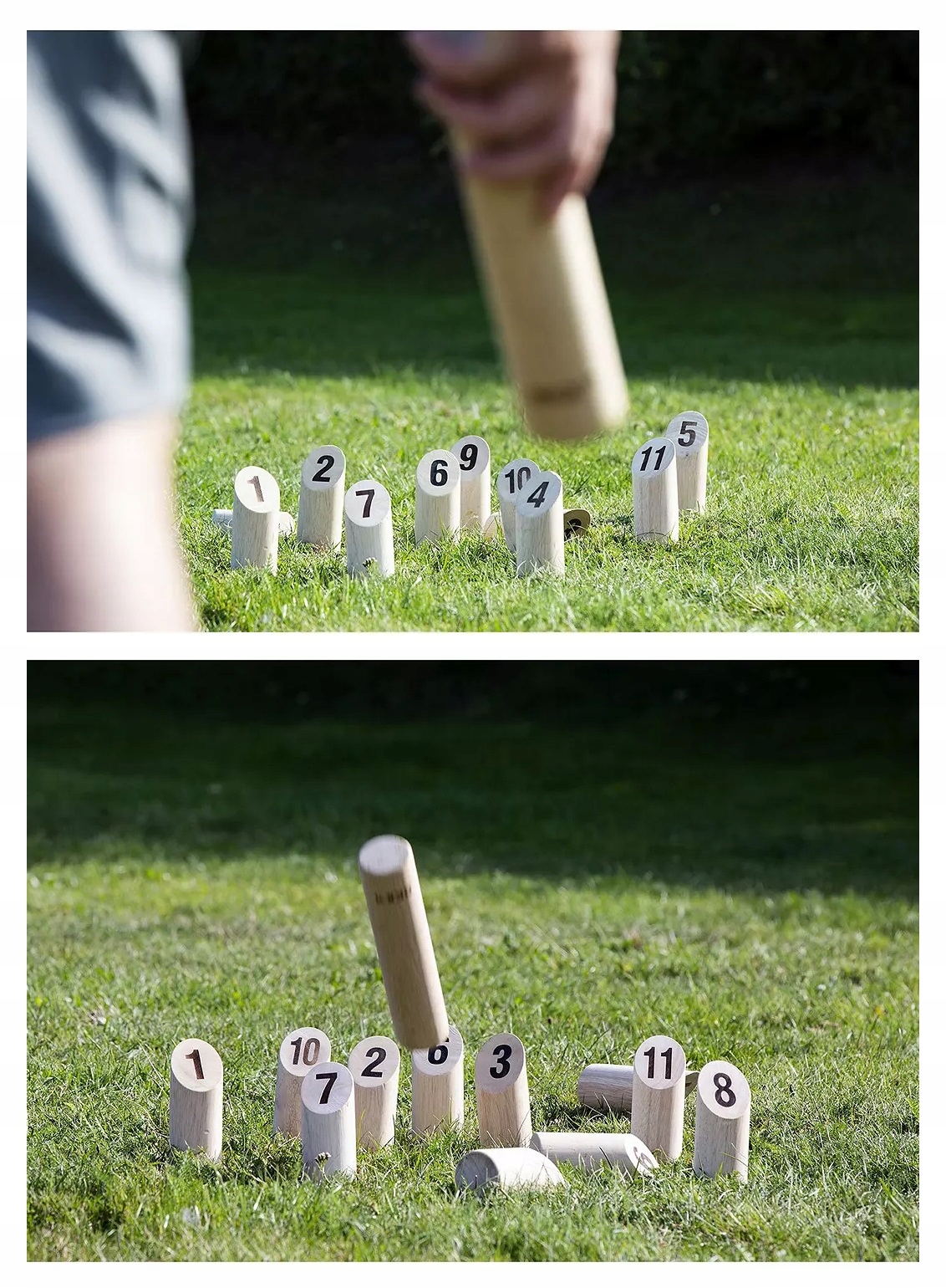 Wykonane z litego drewna sosnowego kręgle i zbijak do rzucania są wyjątkowo trwałe i nadają się do gry na świeżym powietrzu. Numeryczny Kubb to ekscytująca gra parkowa dla 2 lub więcej osób, im więcej, tym lepiej!