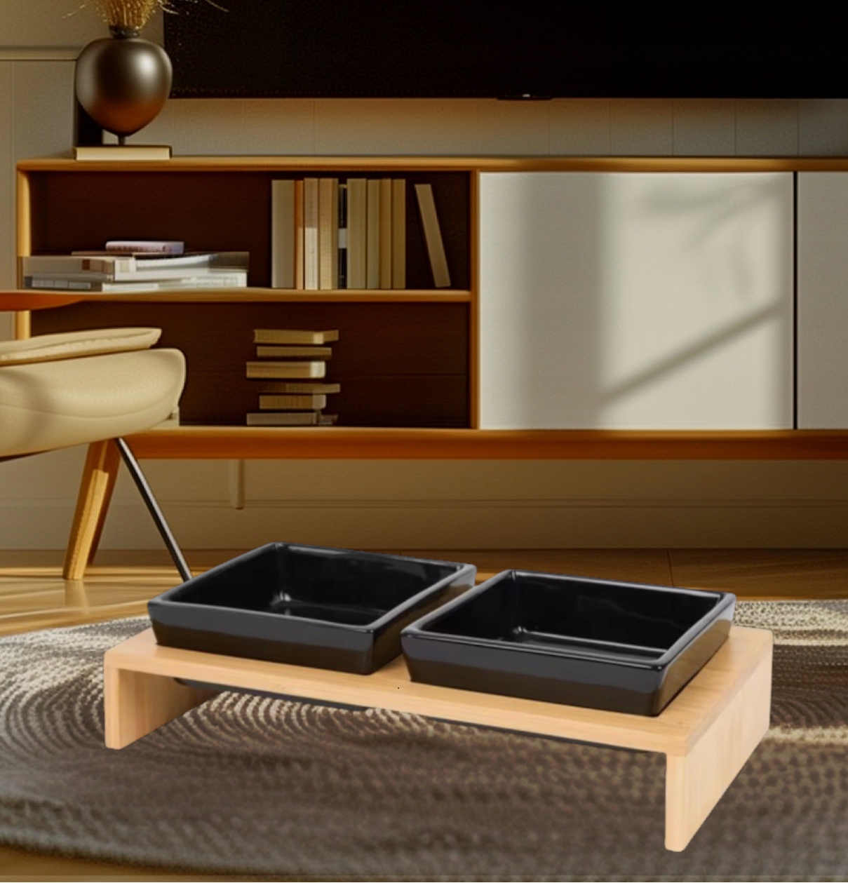 Czarne błyszczące ceramiczne miski razem z drewnianym stojakiem to estetyczny zestaw, który pasuje do wystroju każdego nowoczesnego domu.