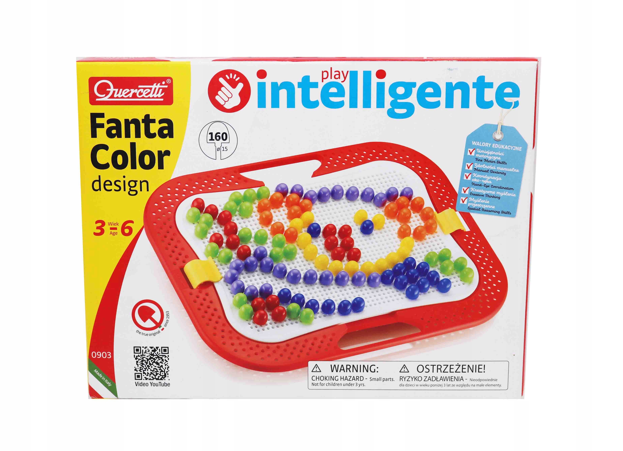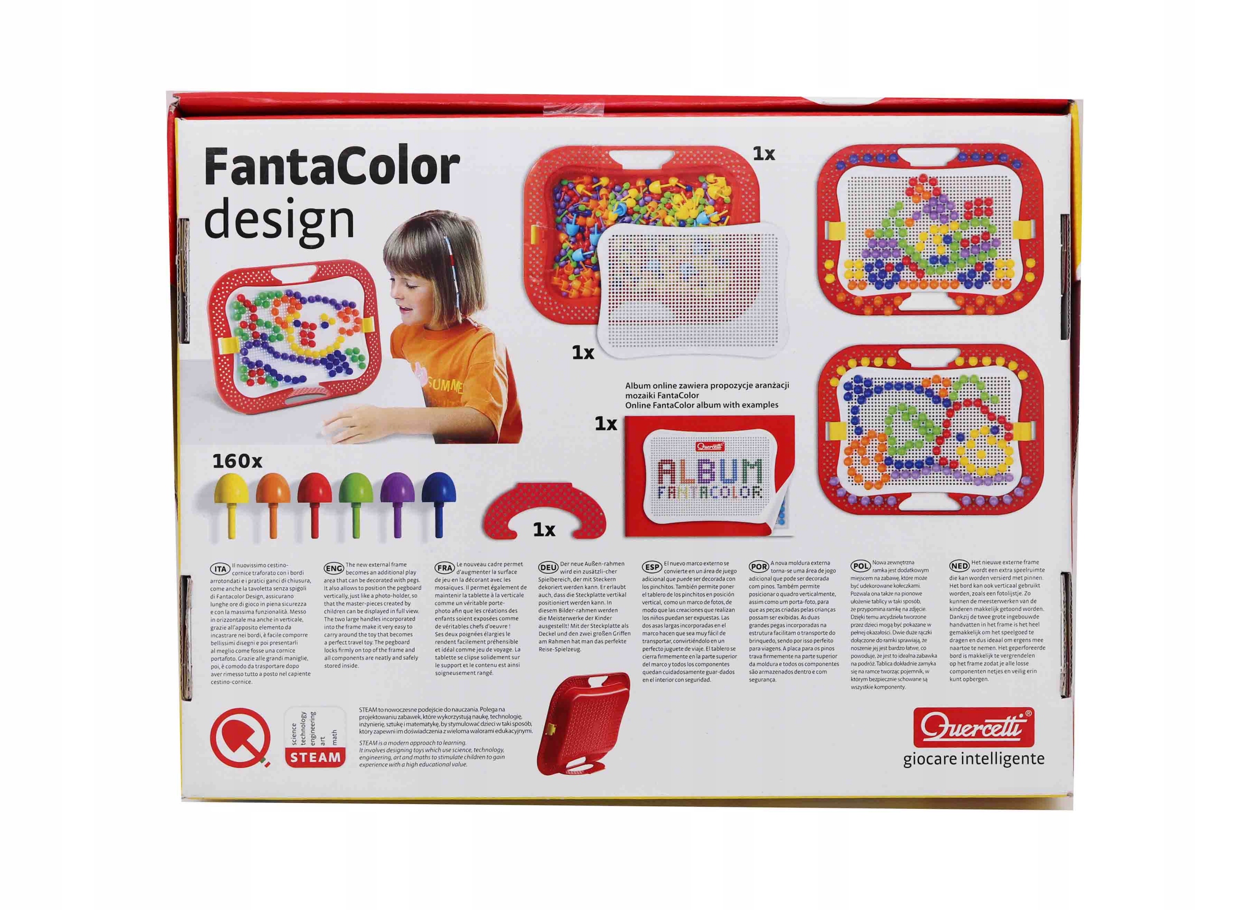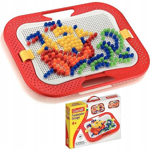 Razem z mozaiką FantaColor od Quercetti dzieciaki mogą układać różnorodne mozaikowe kompozycje z kolorowych kołeczków na specjalnej, perforowanej tablicy.