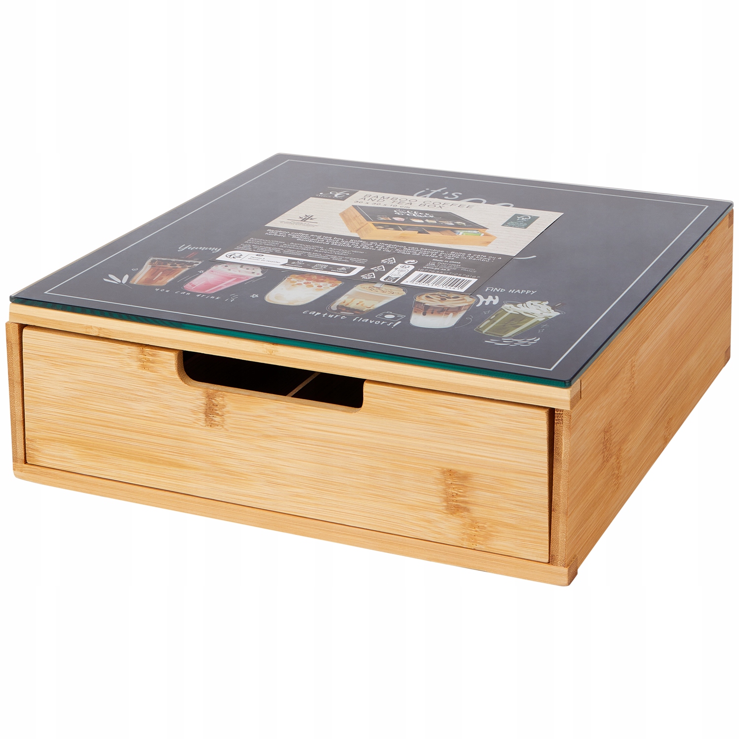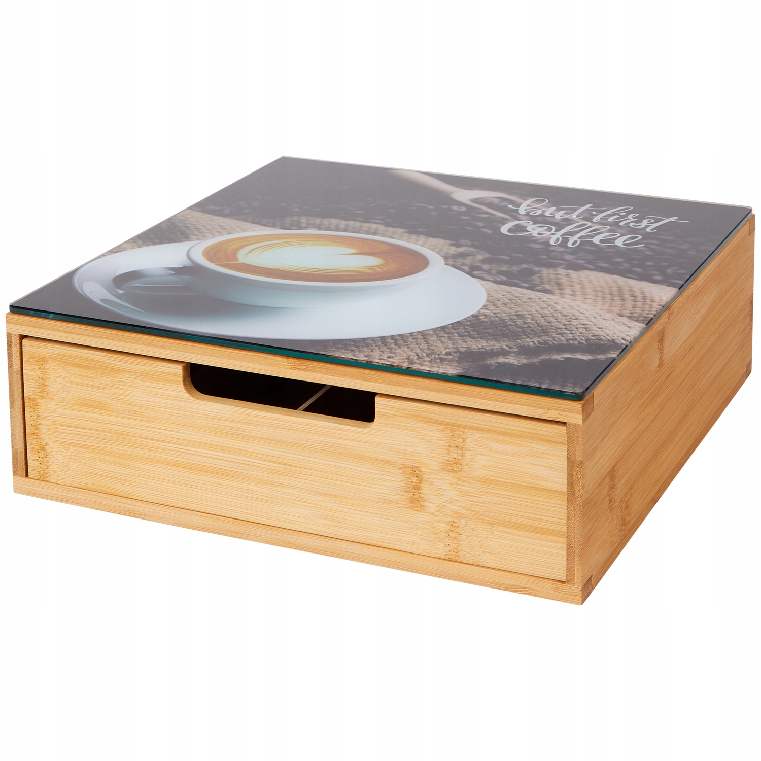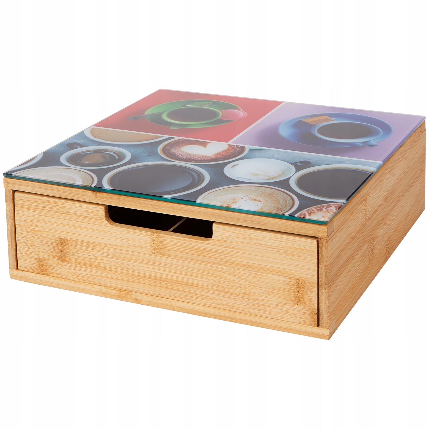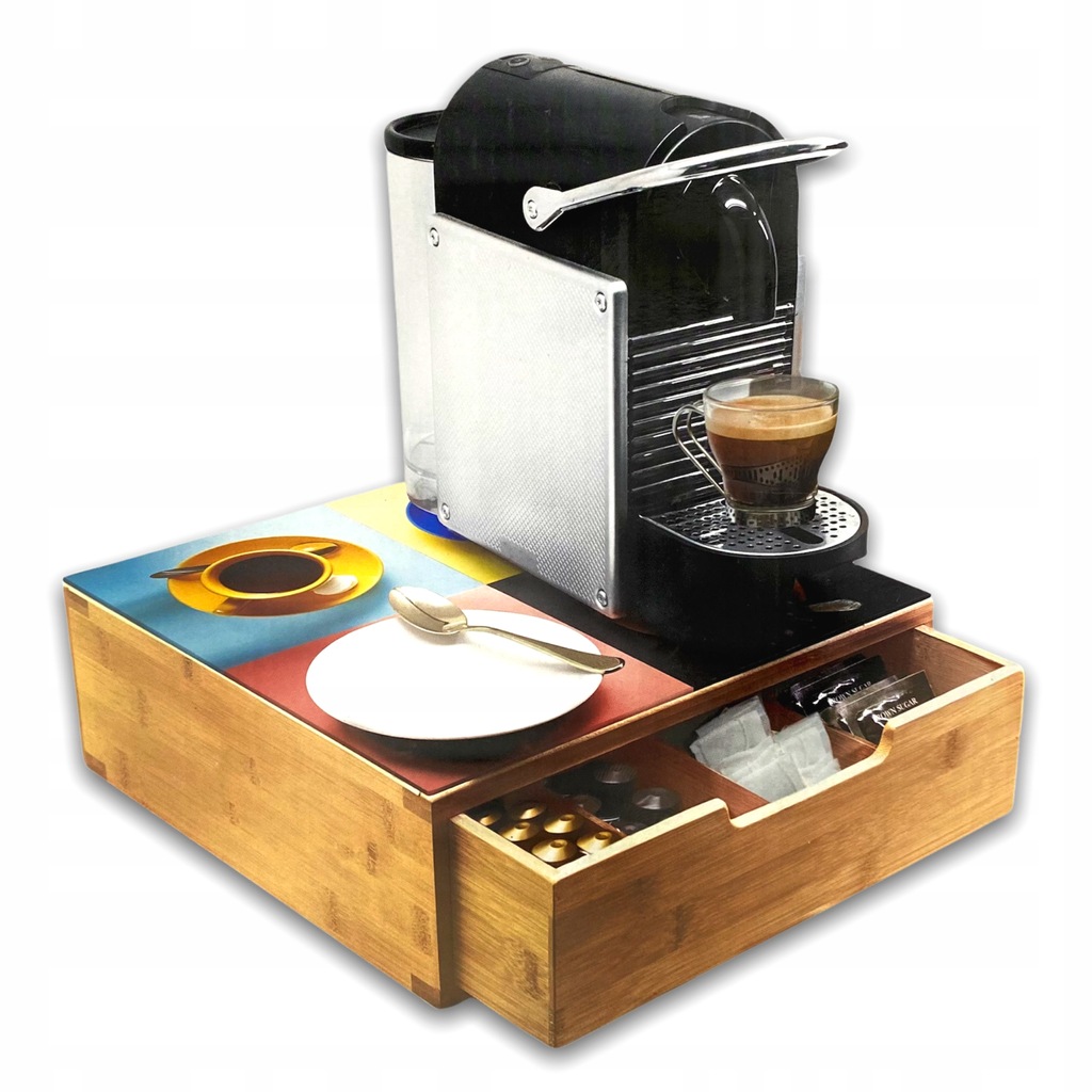 Pojemnik z szufladą posiada szklany blat o wymiarach 30 x 30 cm - ozdobiony grafiką . Przystosowany pod ekspres kapsułkowy lub ciśnieniowy. Wszelkie zabrudzenia na blacie będą łatwe do usunięcia.