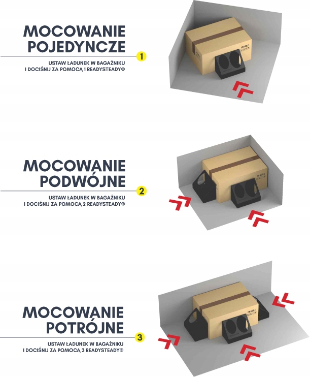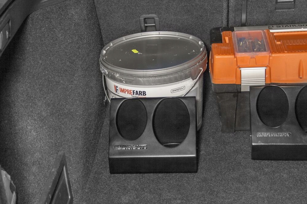 ReadySteady® dzięki trzem elementom składowym umożliwia bezpieczne przymocowanie od niewielkich przedmiotów po wyjątkowo duże, jak worek z cementem czy skrzynka piwa. Masz pojedynczą rzecz do przewiezienia? Wystarczy umieścić organizer obok tego przedmiotu i docisnąć go do dywanu bagażnika. W przypadku większych gabarytów, możesz utworzyć swoistą palisadę, wykorzystując trzy elementy. Tym sposobem można unieruchomić nawet bardzo ciężkie przedmioty. Potrzebujesz mieć torbę z laptopem czy torebkę pod ręką? Dzięki ReadySteady® można ją przytwierdzić do dywanika przed siedzeniem pasażera z przodu lub za fotelami. Masz pewność, że podczas jazdy zawartość pozostanie na swoim miejscu.
