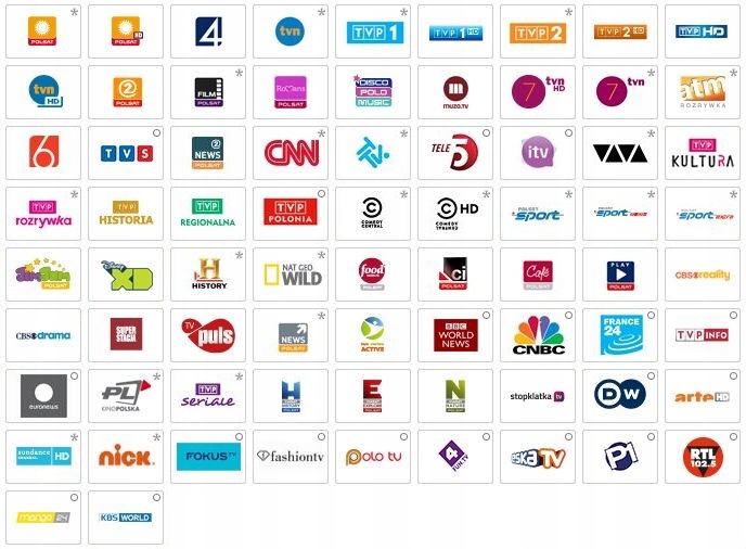Polsat HD, TV4, TV4 HD, TVN,TVN HD, TVN7 HD, TVN FABUŁA, TVP1 HD, TVP2 HD, TVP3, TV PULS, TVPHD, POLSAT2 HD, POLSAT FILM HD, ZOOM TV, NOWA TV, POLSAT NEWS HD, SUPERSTACJA, COMEDY CENTRAL, CBS ACTION, METRO, NAT GEO WILD HD, HISTORY, FOKUS TV HD, POLSAT VIASAT HISTORY HD , POLSAT VIASAT EXPLORE HD, POLSAT VIASAT NATURE, CI POLSAT, TVP HISTORIA, TVP KULTURA, POLSAT CAFE HD, POLSAT PLAY HD, TV6, CBS REALITY, HOME GARDEN, FOOD NETWORK HD, WELLBEING NETWORK, VIVA, POLSAT MUSIC HD, DISCO POLO MUSIC, POLSAT SPORT EXTRA, POLSAT SPORT, POLSAT JIM JAM, DISNEY XD, TVP ABC, TELE5, POLONIA 1, TVP INFO, TVS, TVP POLONIA, POLO TV i wiele innych niekodowanych FTA.