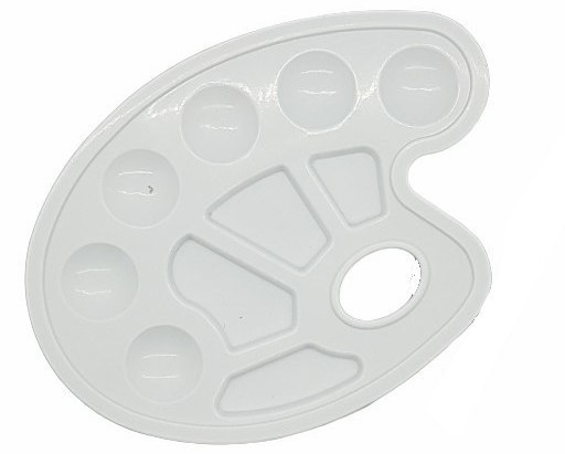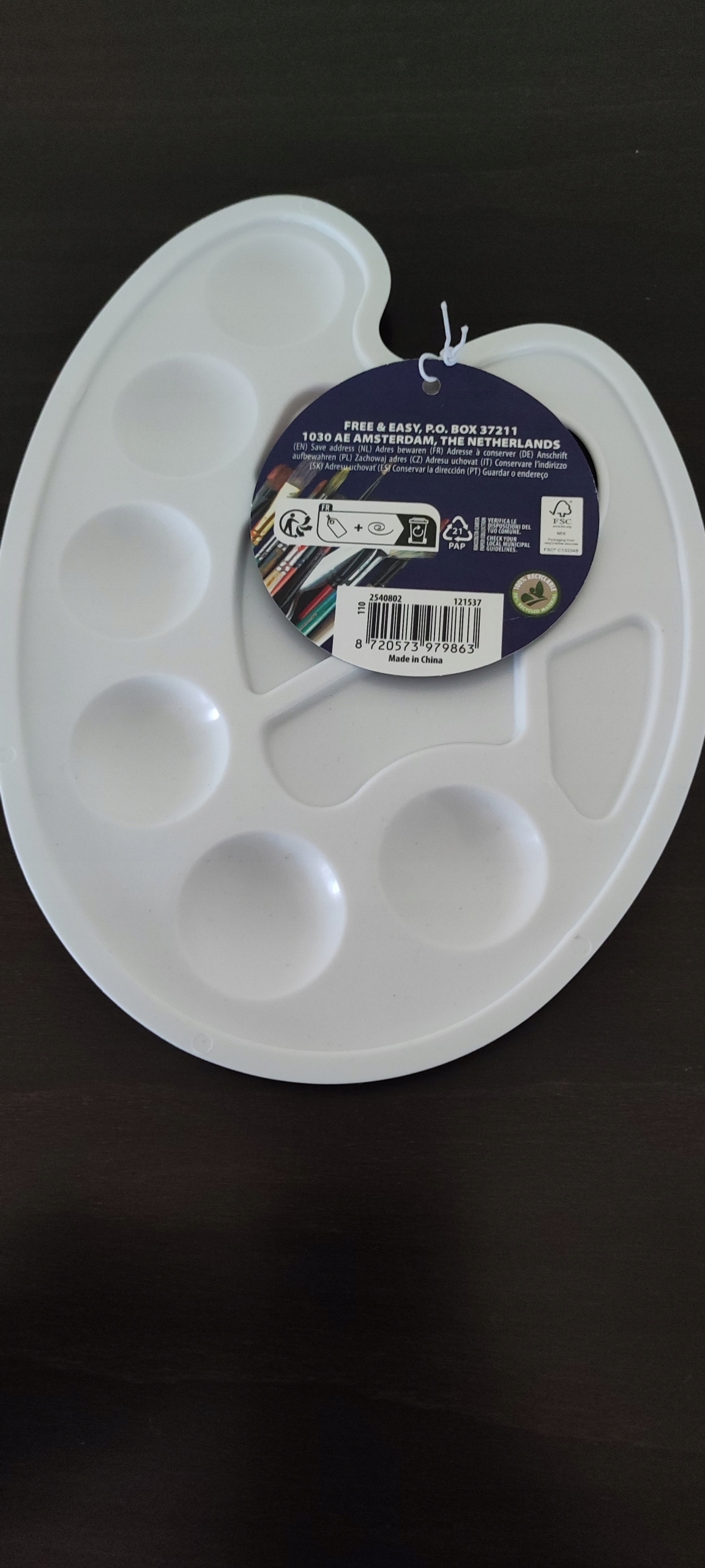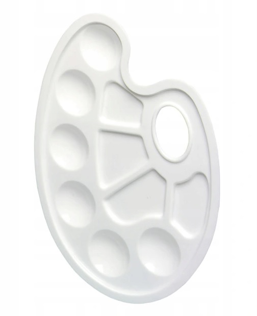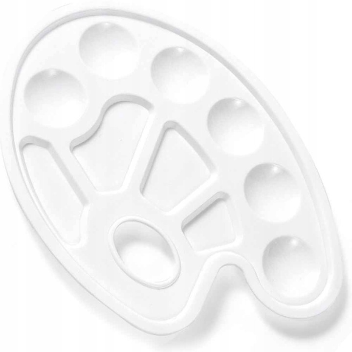 Paletka posiada 6 okrągłych wgłębień na farby, oraz 4 w różnych kształtach, do mieszania kolorów.