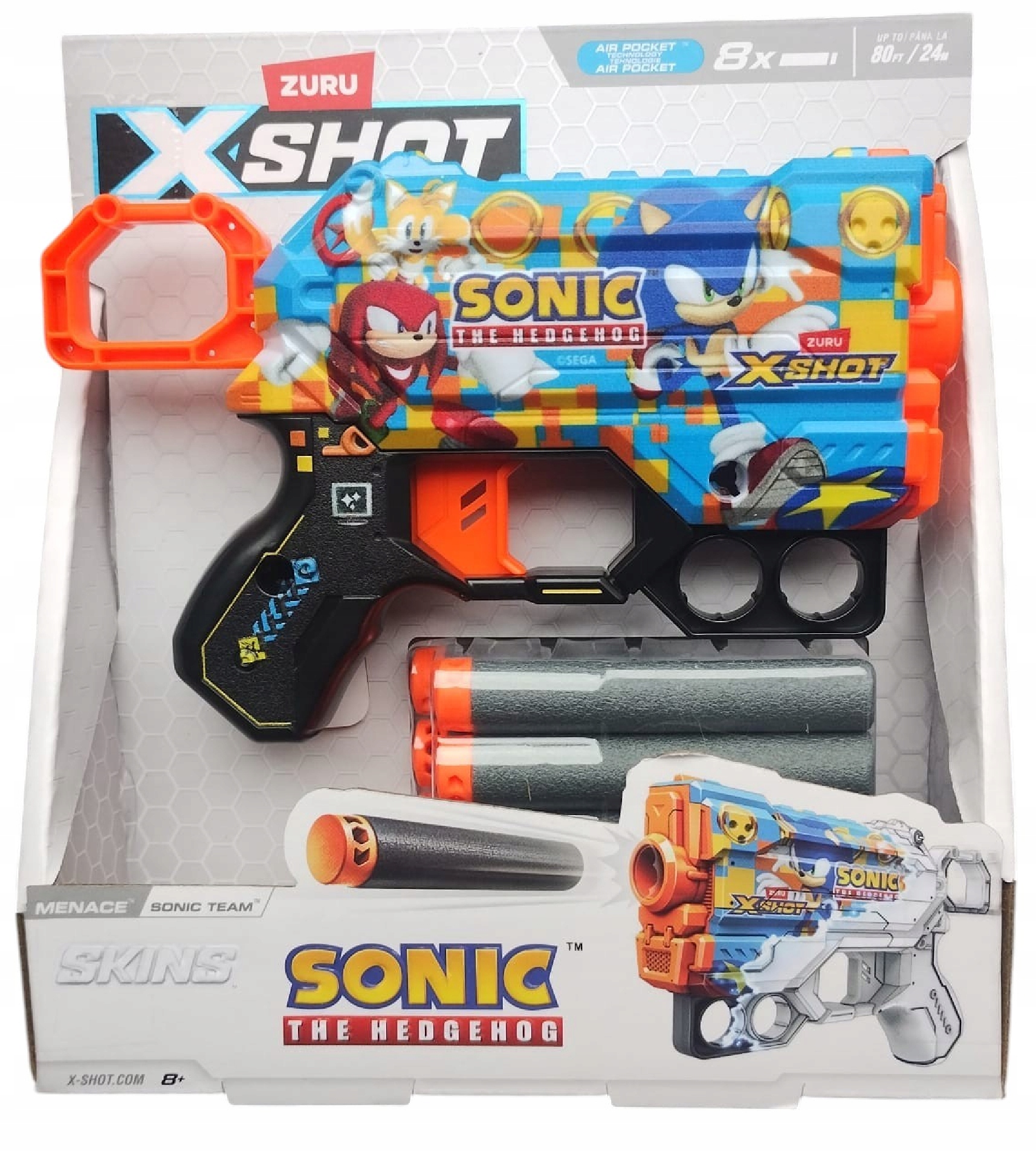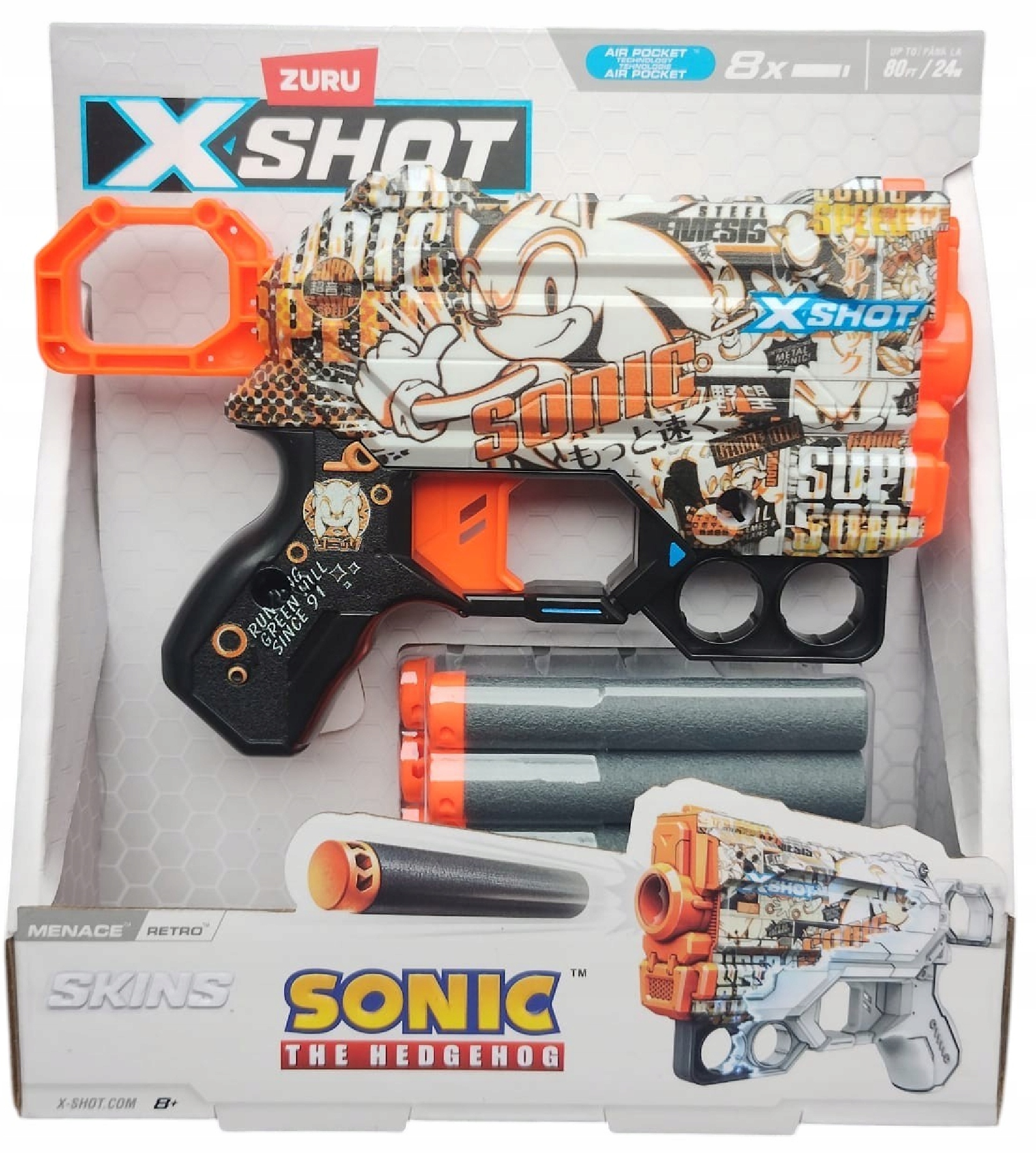 Przygotuj się na superszybką zabawę z małym pistoletem Sonic z serii Zuru X-Shot Skins! Ta dynamiczna wyrzutnia z kultowym motywem postaci z gry „Sonic the Hedgehog” to idealna propozycja dla dzieci, które kochają ruch, celność i kolorowe gadżety.