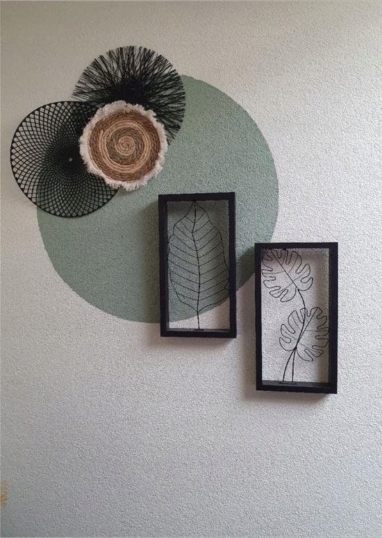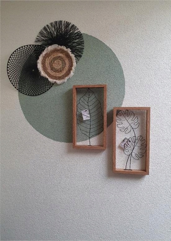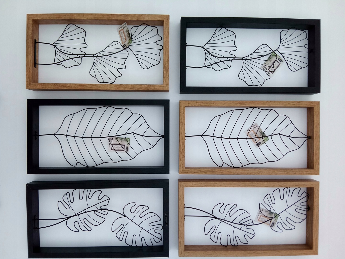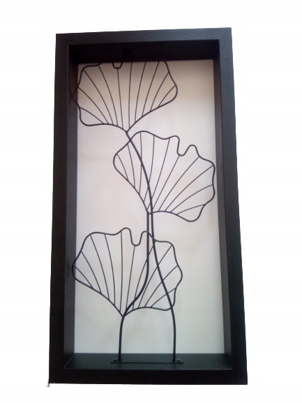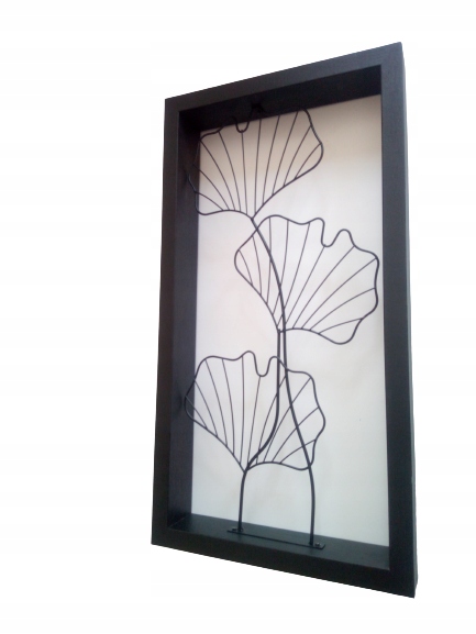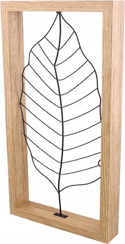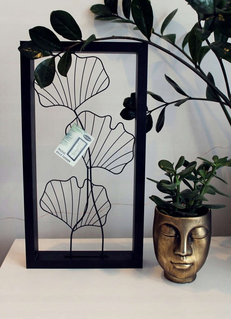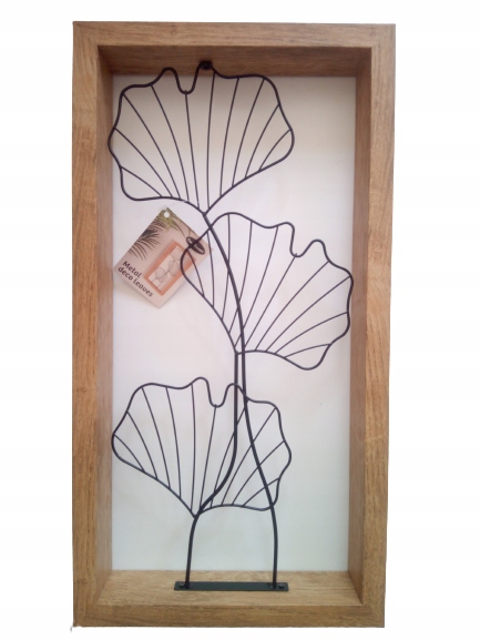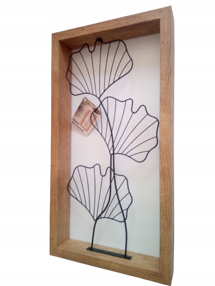 Dekoracyjna, drewniana rama z metalowymi liśćmi.