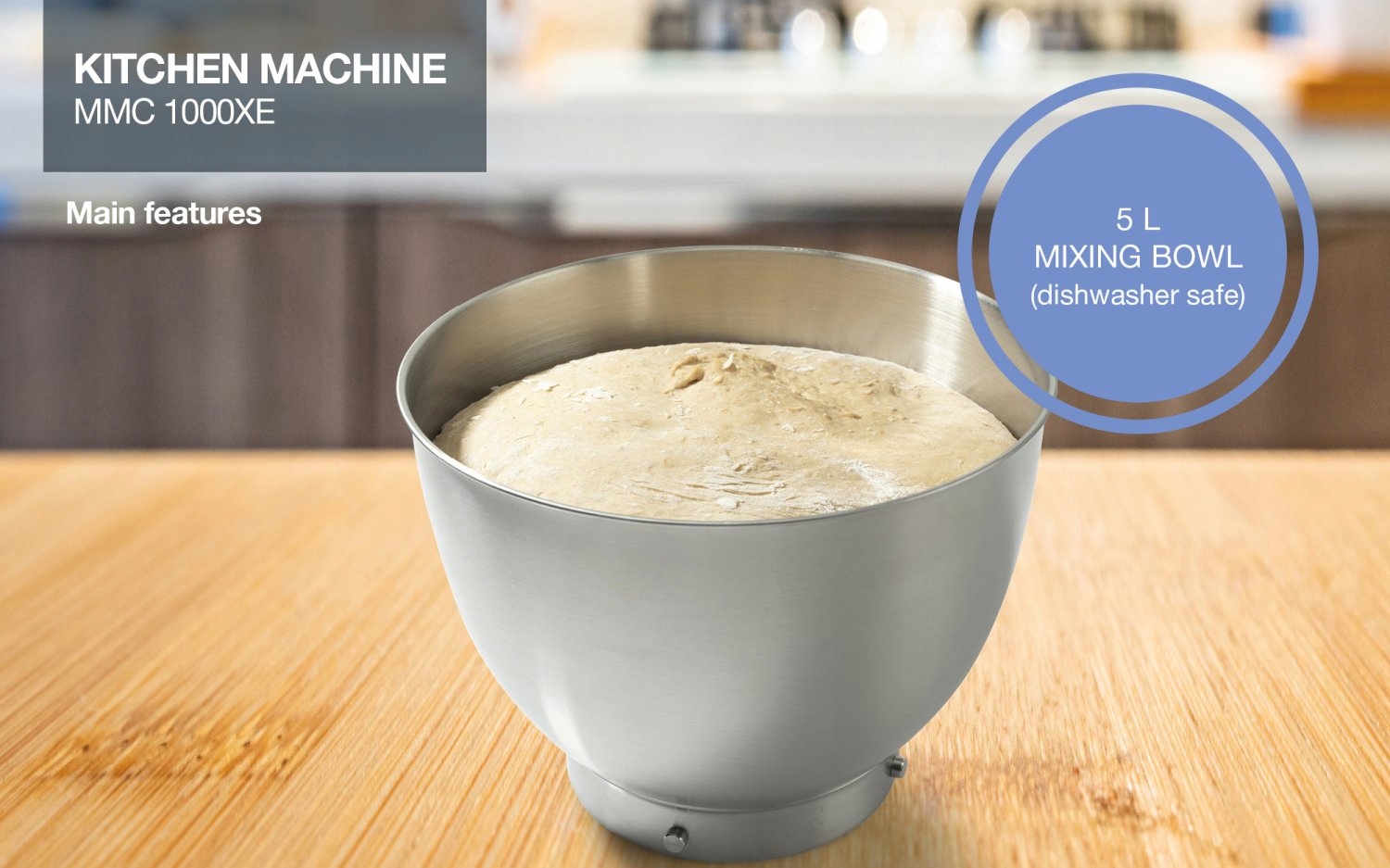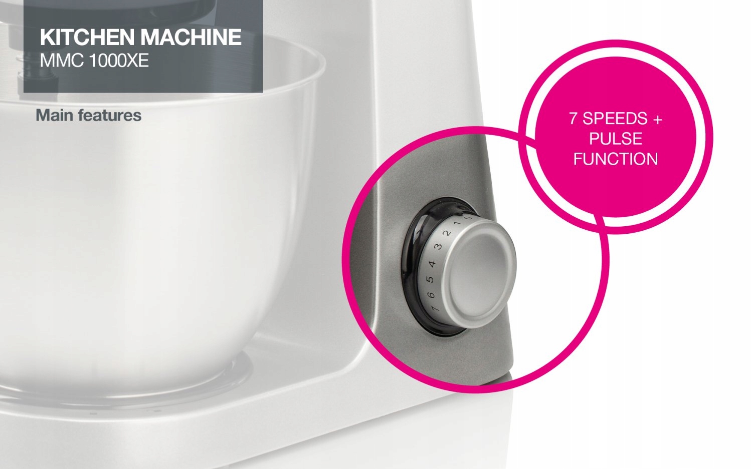 Moc silnika (maksymalna): 1000 W, Liczba poziomów prędkości: 7, Silnik AC dla niezawodnej pracy, Miksowanie składników w 3 kierunkach, Pojemność pojemnika z miarką: 5 l