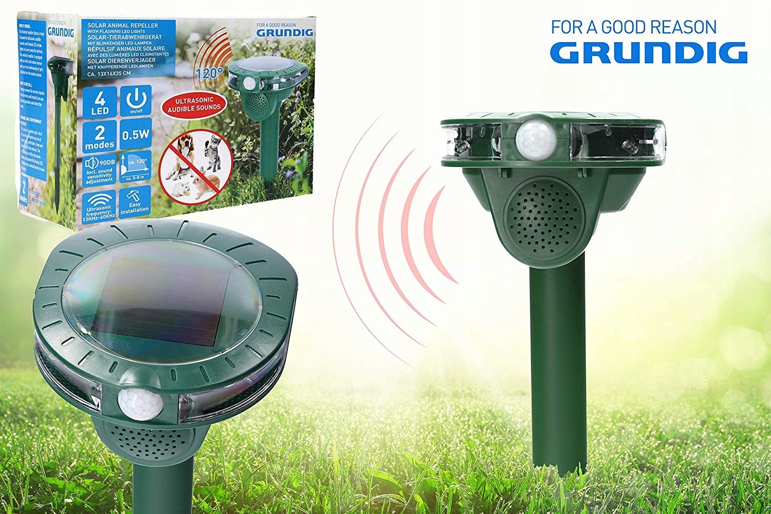 Ogrodowy odstraszacz ultradźwiękowy posiada czujnik ruchu oparty na detekcji podczerwieni, reaguje na ciepło zwierząt, z odległości wykrywa zbliżające się zwierzę po czym uruchamia fale ultradźwiękowe. Fale emitowane przez odstraszacz atakują system nerwowy i słuchowy zwierząt przez co skutecznie odstraszają szkodniki.