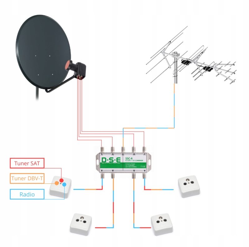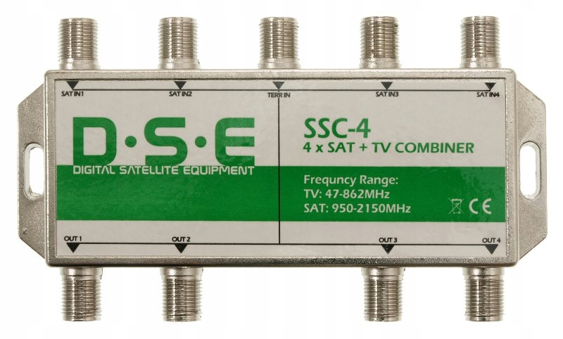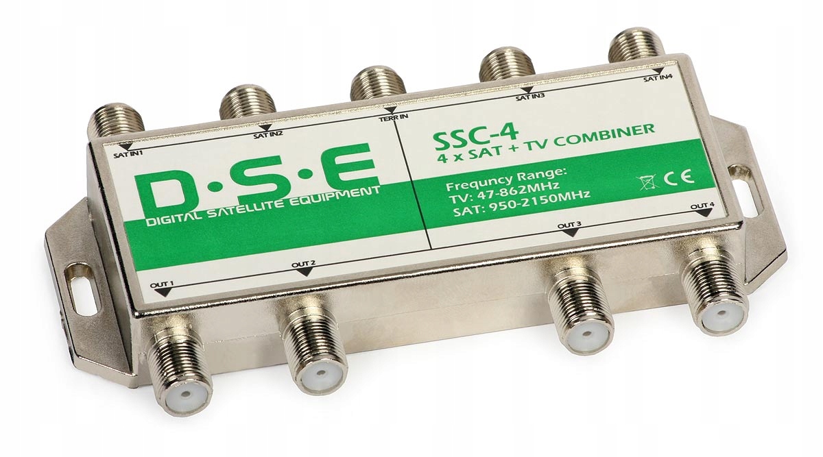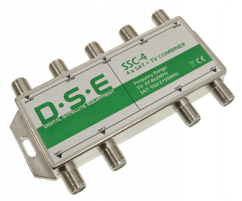 Zwrotnica czterokrotna DSE model SSC4 umożliwiająca zsumowanie sygnału RTV z czterema niezależnymi sygnałami TVSAT (np. z konwertera typu Quad) i doprowadzenie ich do 4 niezależnych gniazd, do stosowania wewnątrz budynków.