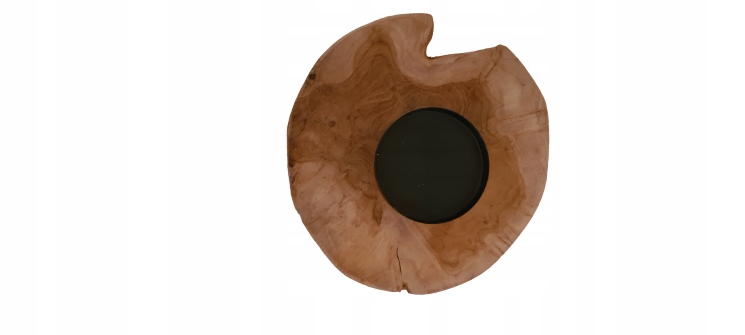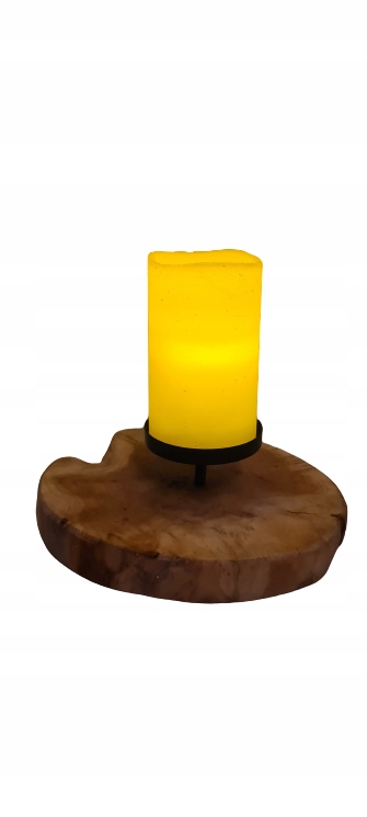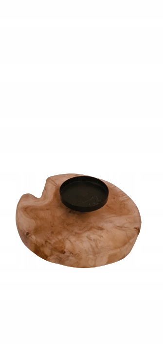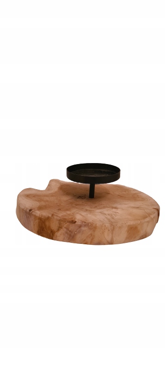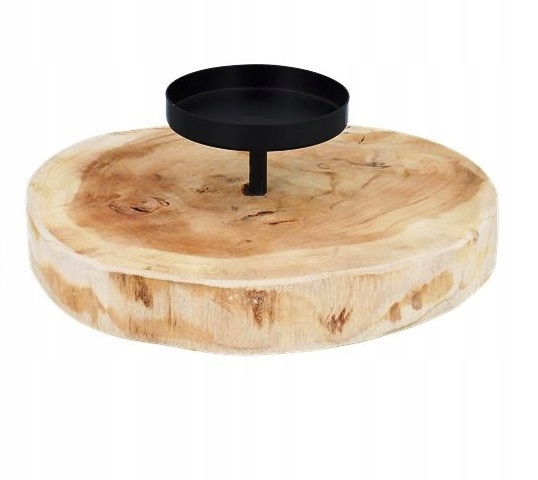 Ozdobny świecznik wykonany z drewna z metalową paterą.