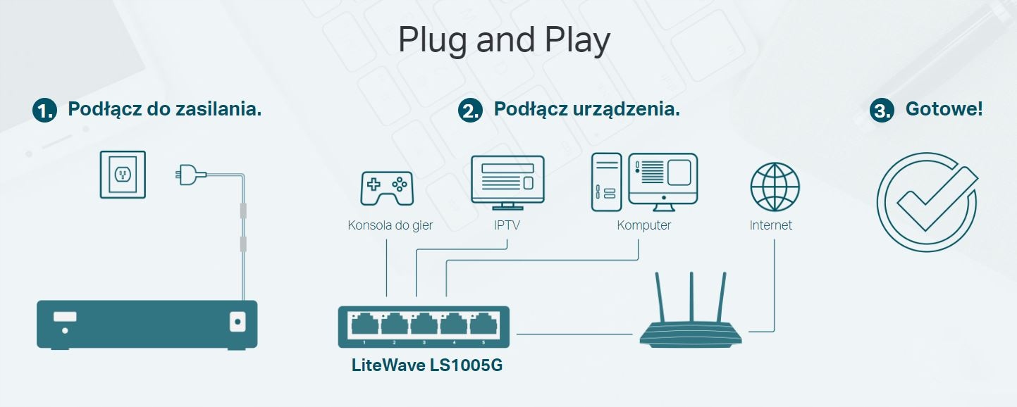 ✅ Niezarządzalne przełączniki z serii LiteWave TP-Link to łatwy i korzystny cenowo sposób rozbudowy sieci przewodowej. Urządzenia nie sprawiają trudności w użytkowaniu i są niezawodne. Dzięki instalacji typu plug and play, podłączanie nowych urządzeń trwa zaledwie kilka minut. Wszystkie porty obsługują Auto-MDI/MDIX, dlatego nie trzeba tracić czasu na wybór odpowiedniego kabla.