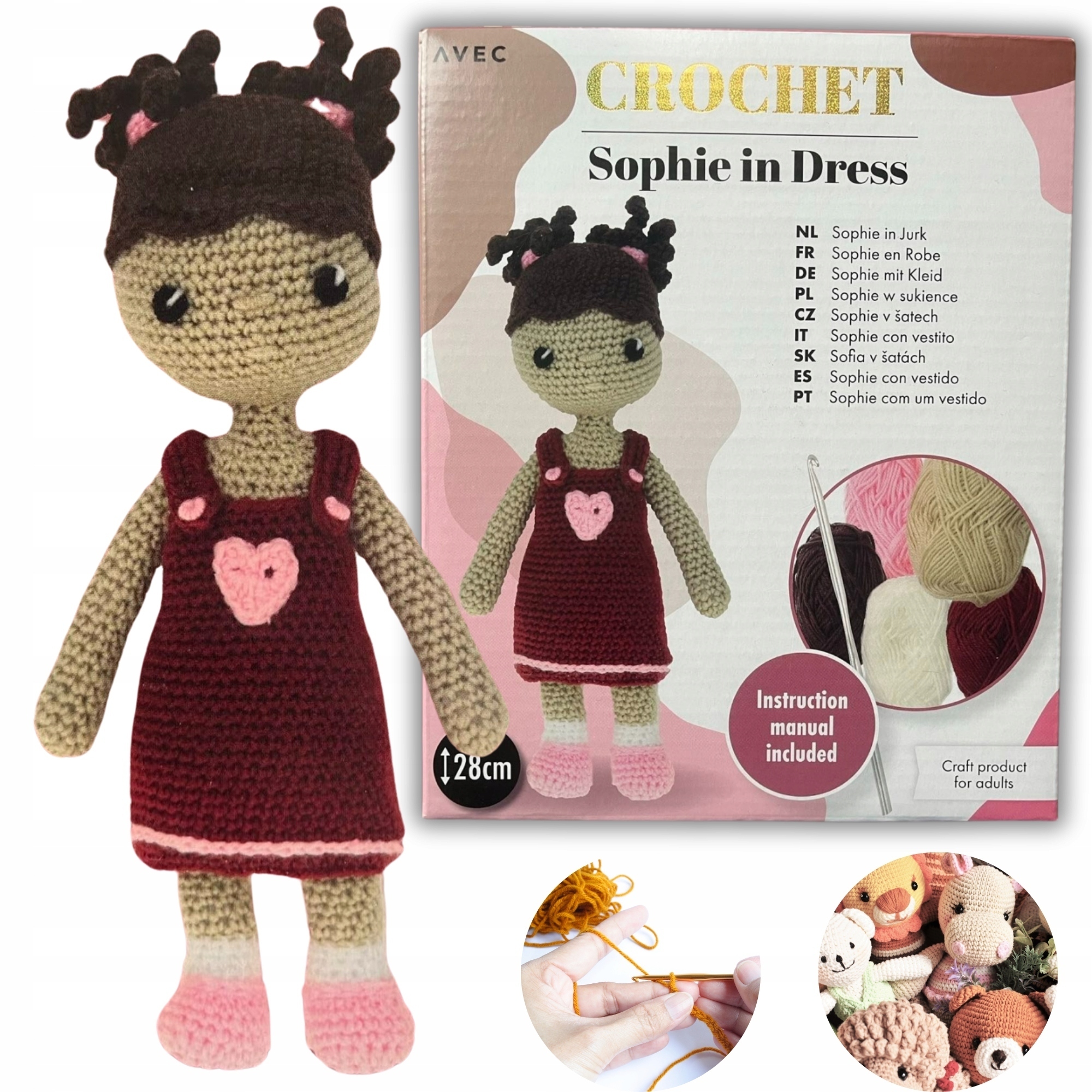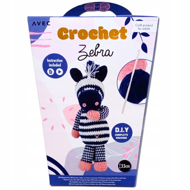 Znajdziesz w nim przędzę szydełko, igłę, wypełniacz oraz szczegółowe instrukcje