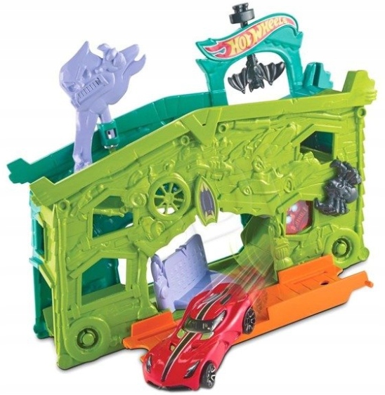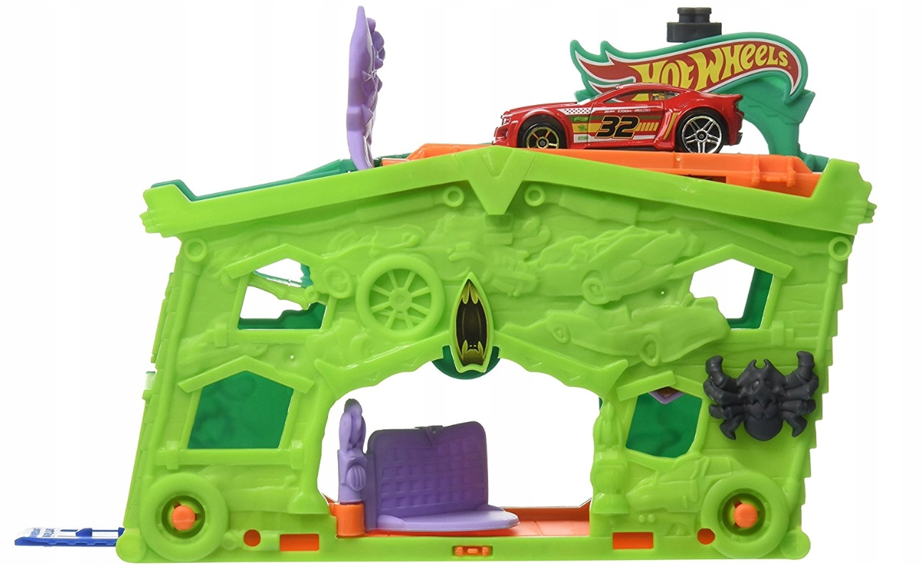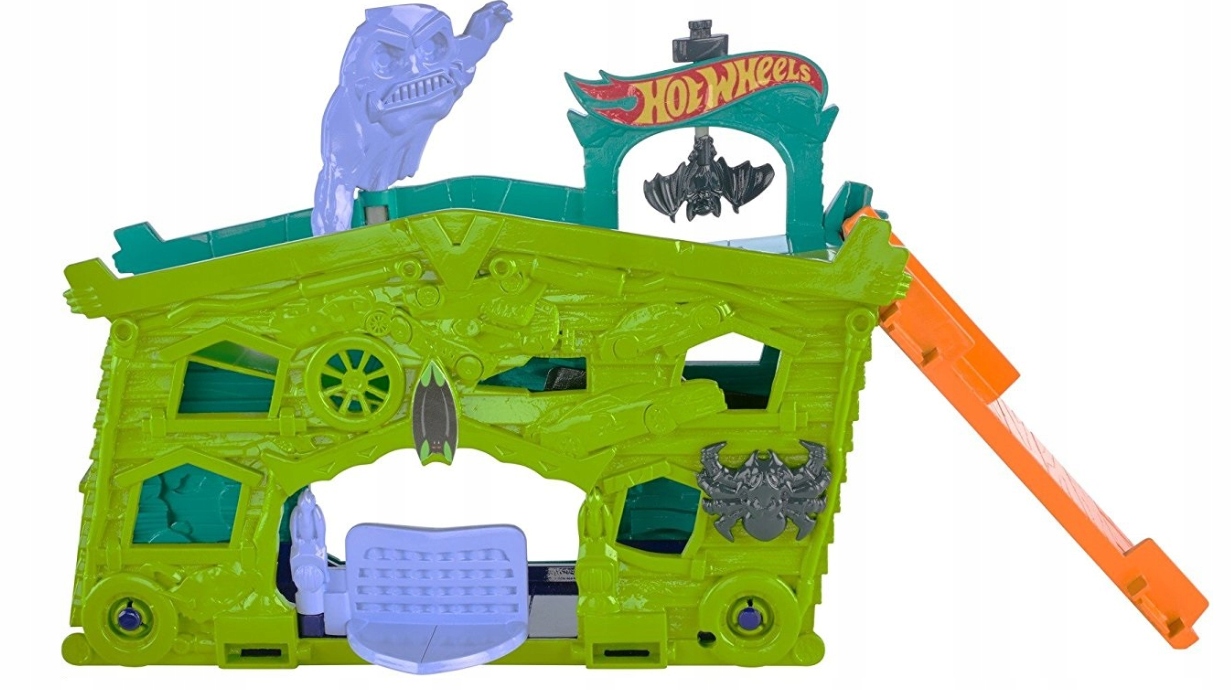 Garaż duchów pozwala poczuć się jak w prawdziwym nawiedzonym miejscu. Twoje samochodziki muszą zachować szczególną ostrożność podczas odwiedzania domu strachów. Zestaw zawiera dodatkowo jeden samochodzik Hot Wheels.