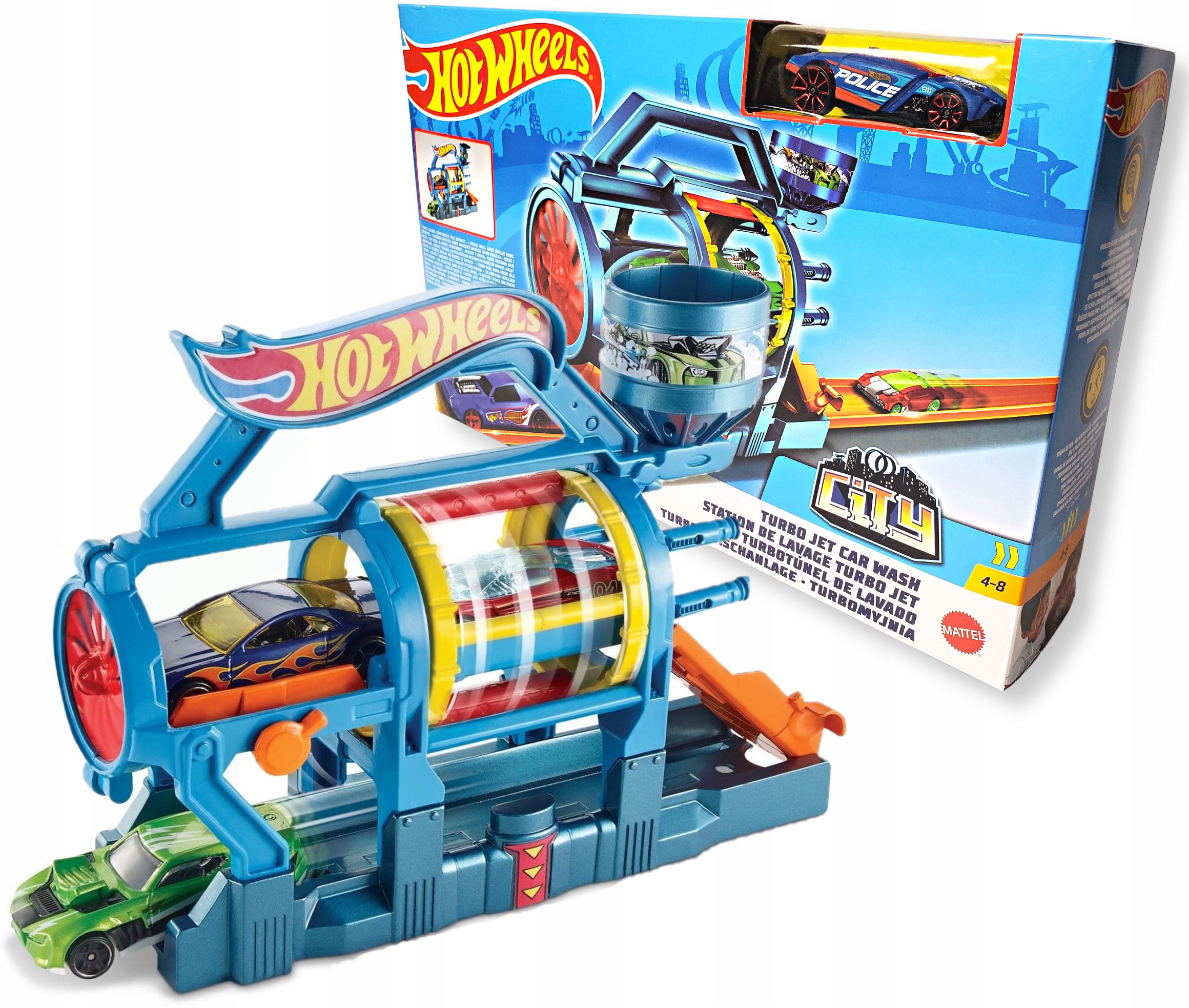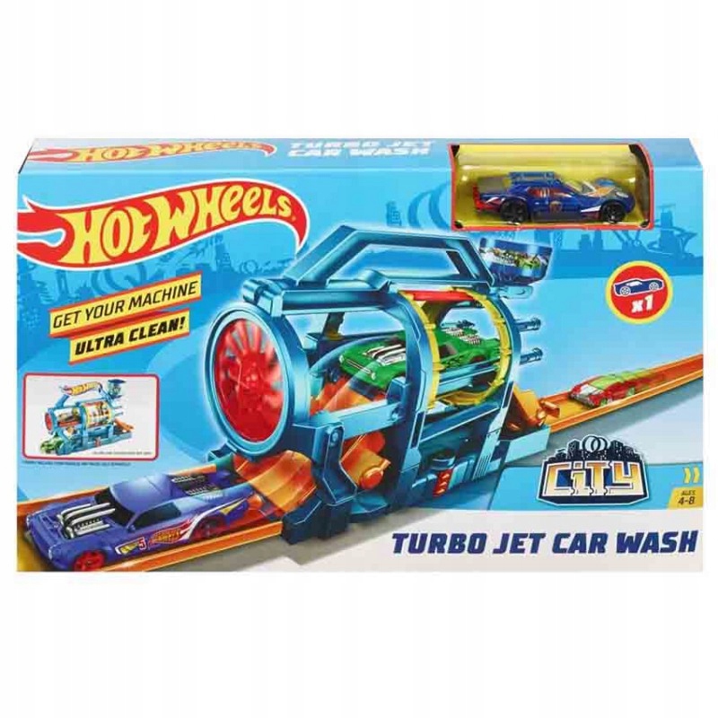 W myjni samochodowej Hot Wheels Twoje pojazdy mogą chwilę odpocząć i błyskawicznie przygotować się do dalszej jazdy. Wystarczy krótka chwila, aby zregenerowane samochodziki Hot Wheels mogły ponownie stawić czoła niebezpiecznym przygodom, które czekają na nie w całym mieście. Zestaw zawiera dodatkowo jeden samochodzik Hot Wheels.