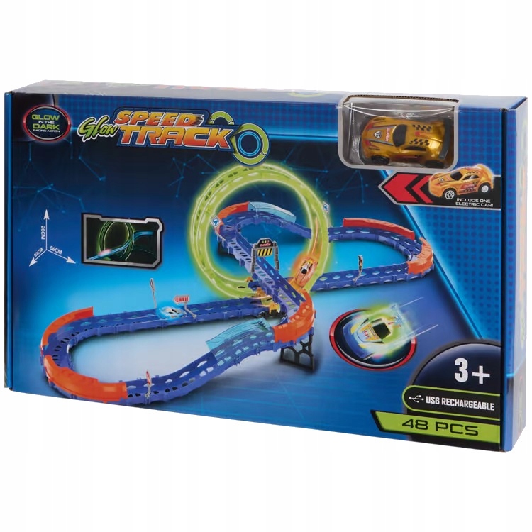 Z samochodem wyścigowym do wielokrotnego ładowania, Z świecącym w ciemności torem, Z ilością 48 elementów!
