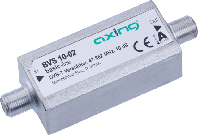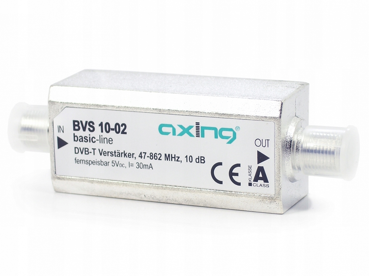 Wzmacniecze liniowe BVS 10-02 firmy AXING służą do wzmocnienia sygnałów TV naziemnej i radia w paśmie 47-862 MHz. Zasilanie do wzmacniacza doprowadzone jest poprzez wyjście sygnału (wzmacniacz liniowy). Wzmacniacz zamknięty jest w elektromagnetycznie szczelnej odlewanej metalowej obudowie zakończonej odpowiednio gniazdem i wtykiem F. Wzmacniacz może być montowany na zewnątrz pod warunkiem zabezpieczenia przyłączy kabla koncentrycznego przed deszczem, śniegiem itp. wzmacniacze są odporne na zakłócenia elektromagnetyczne i zalecane do stosowania przy antenach TV naziemnej zamiast dotychczasowych "płytek" w antenach.
