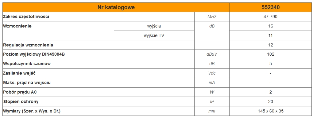 Wzmacniacz Televes 552340 oferuje wzmocnienie do 16dB oraz regulacje wzmocnienia w zakresie 12dB.