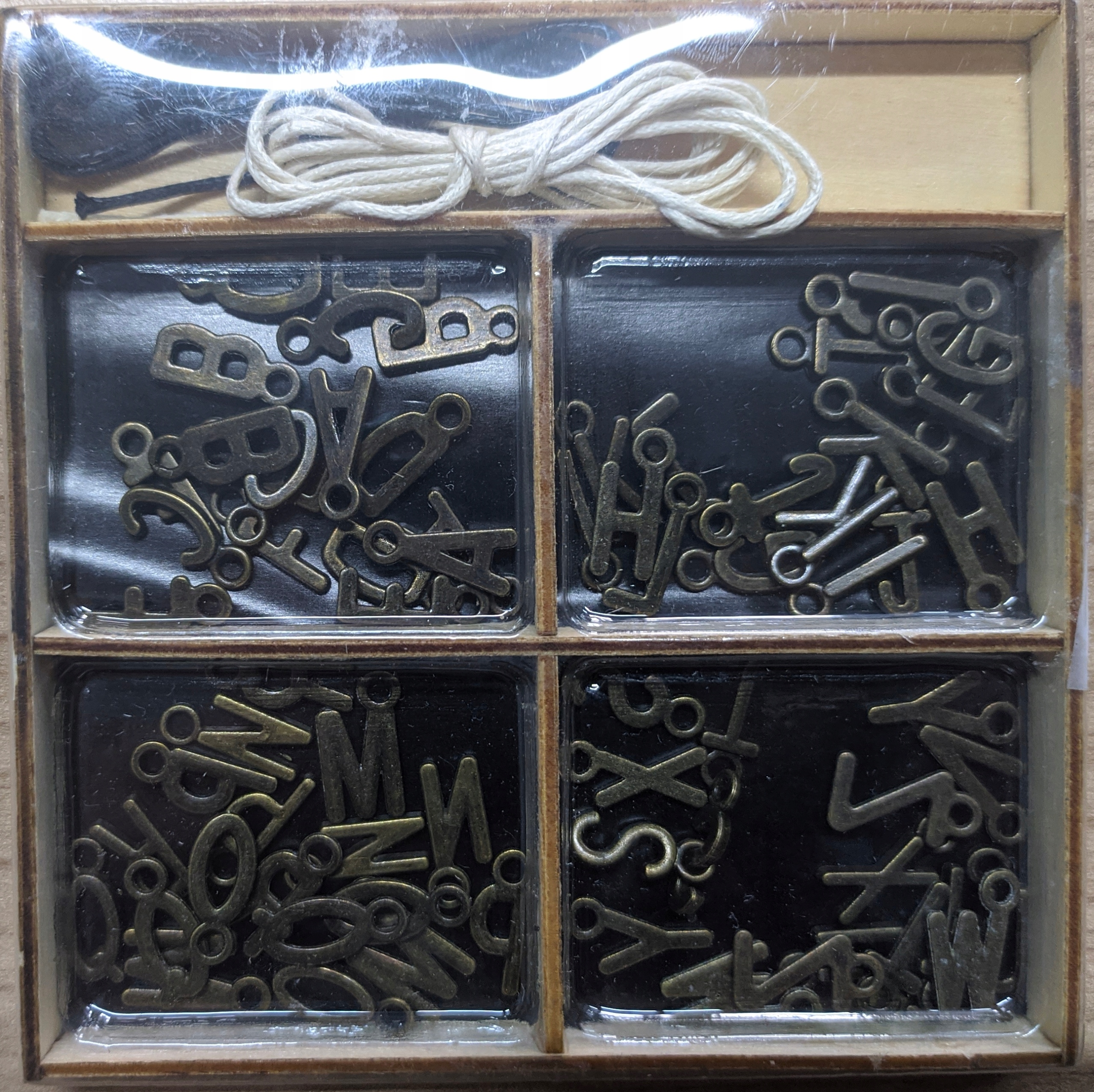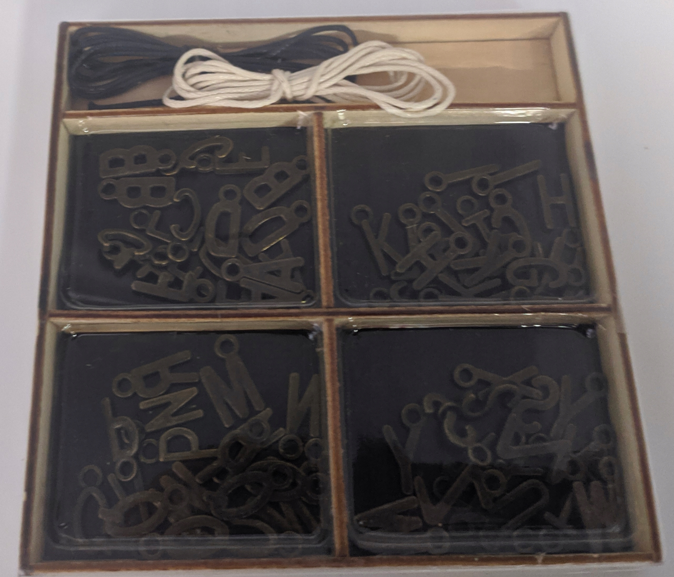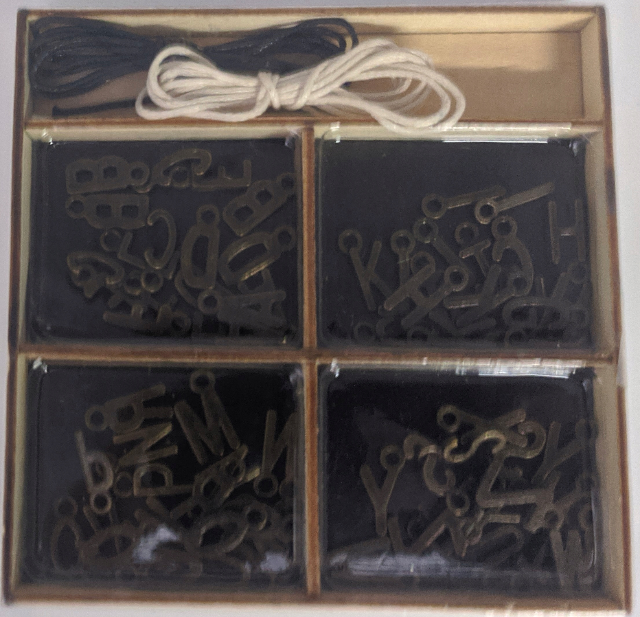 W zestawie dwa sznurki woskowane, na których można układać dowolne napisy z załączonych literek