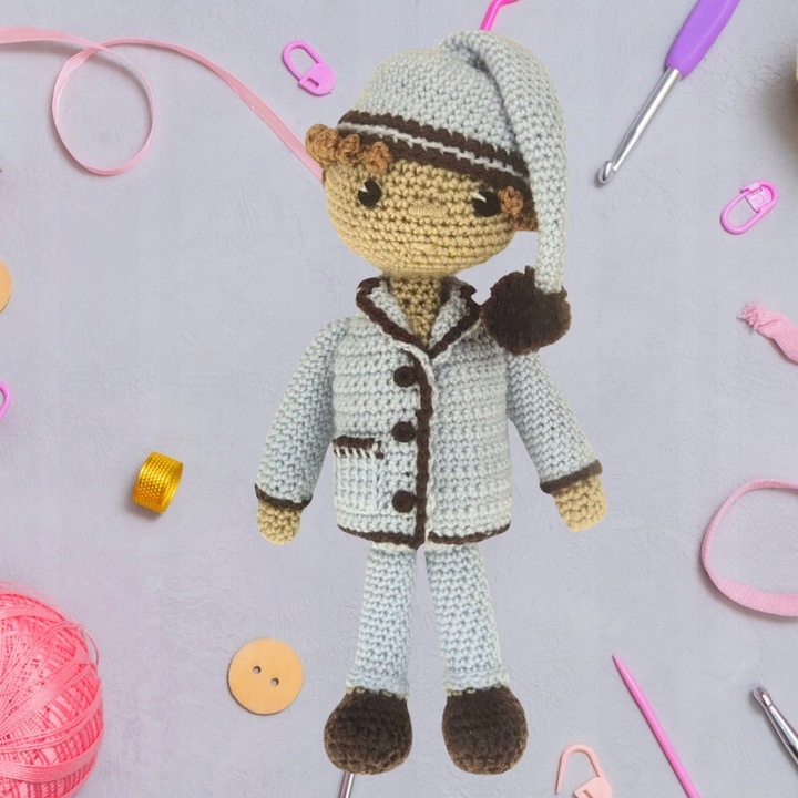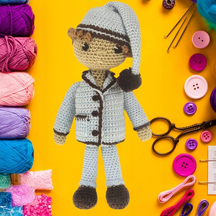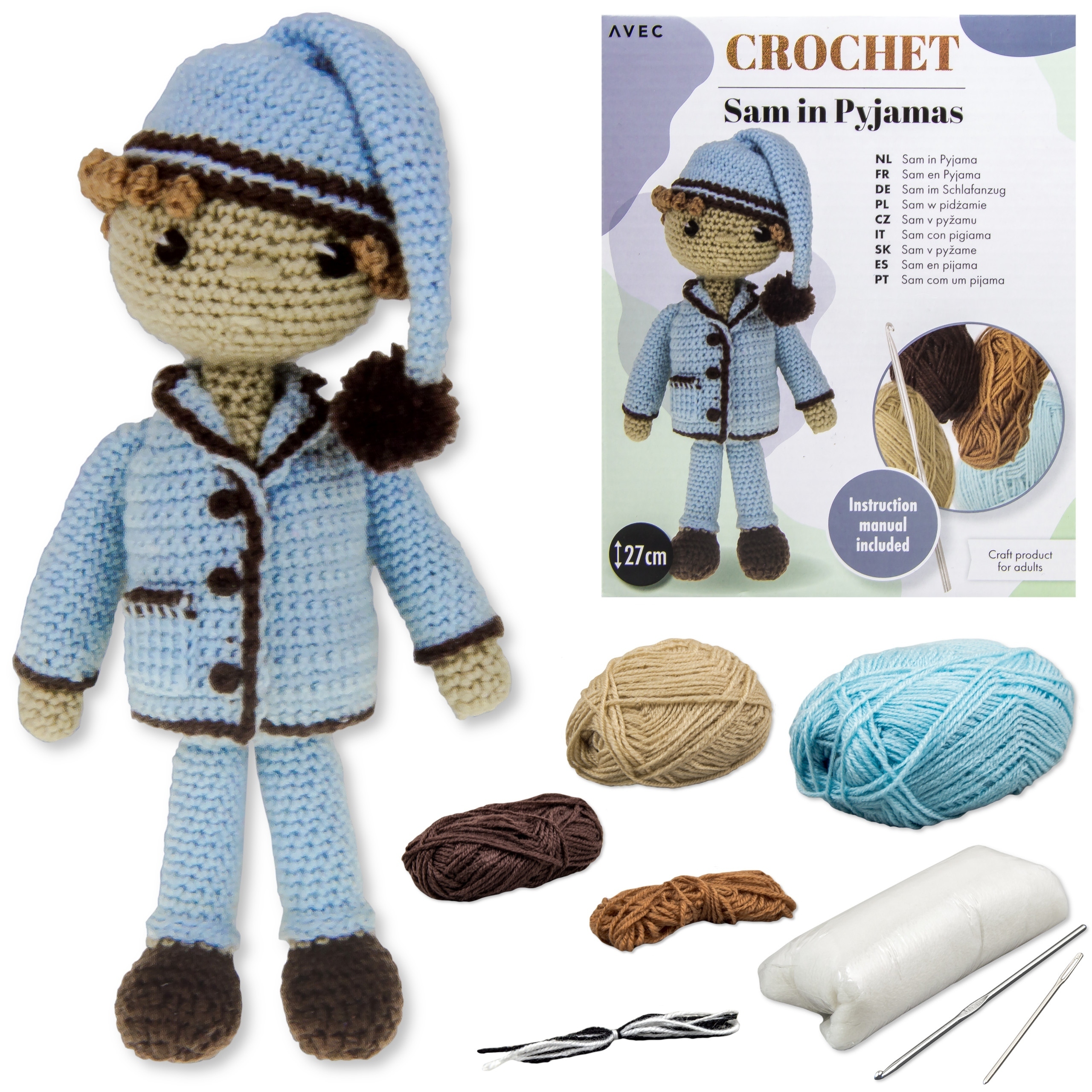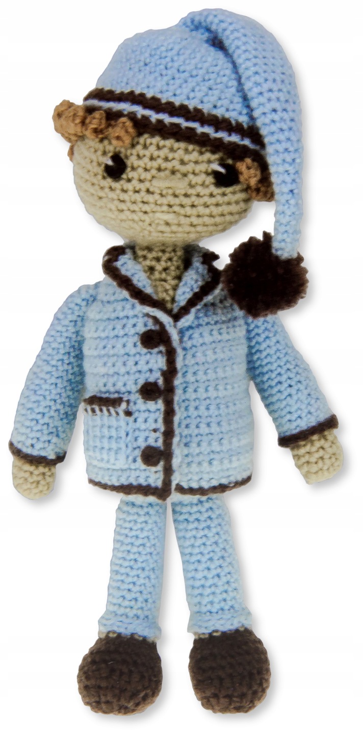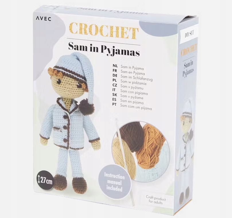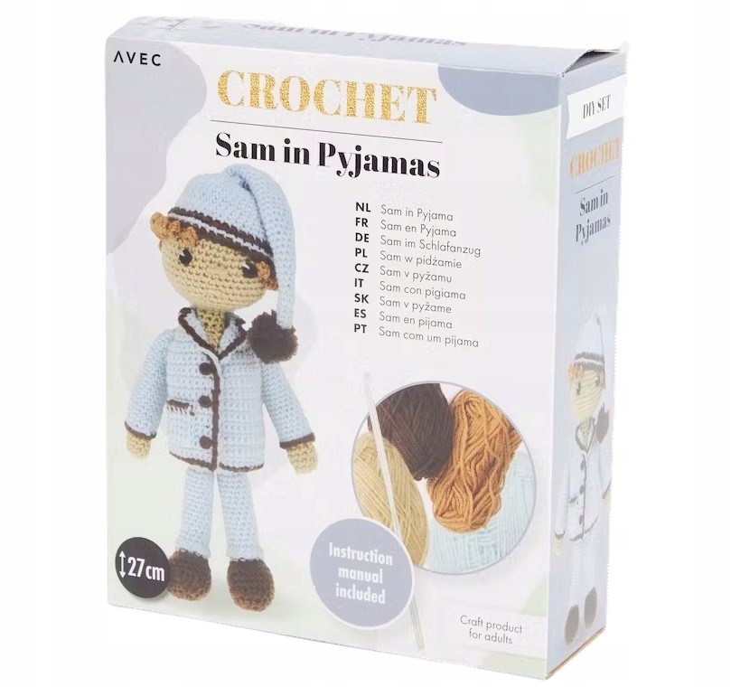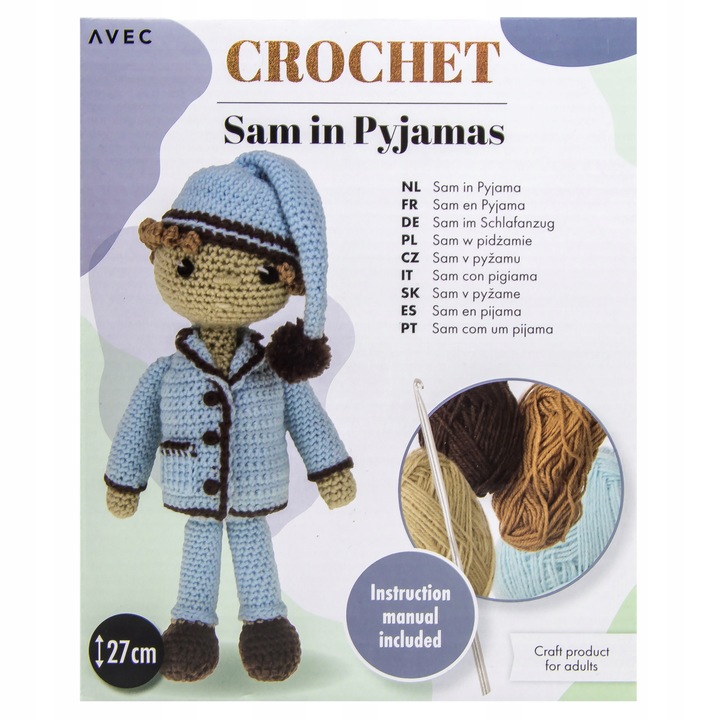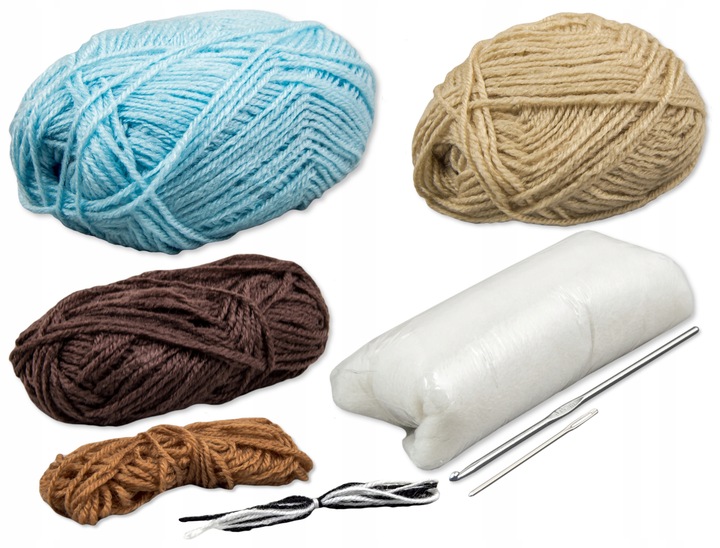 Zestaw zawiera wszystkie potrzebne elementy, które będą potrzebne do wykonania przedstawionej na obrazku maskotki. W komplecie znajdują się miękkie i przyjemne w dotyku akrylowe włóczki w kolorach: niebieski, beżowy, brązowy, jasny brązowy, biały oraz czarny; wypełnienie z włókna syntetycznego, ergonomiczne szydełko, igłę do cerowania oraz przejrzystą czytelną instrukcję w języku polskim. W instrukcji zawarte są podstawowe techniki szydełkowania, dzięki którym wykonasz maskotkę.