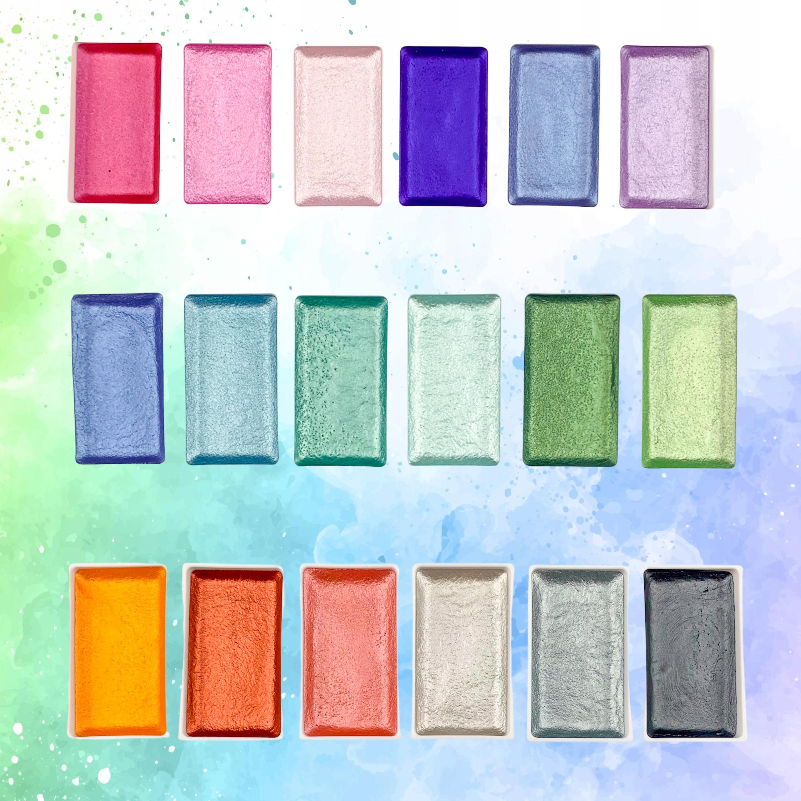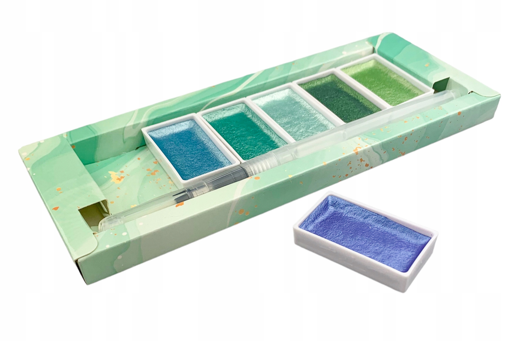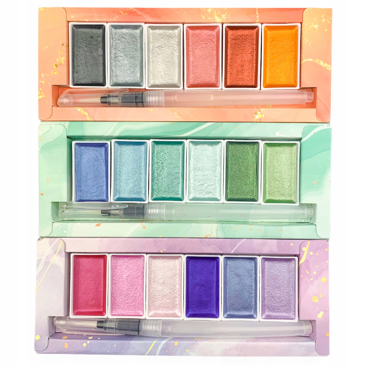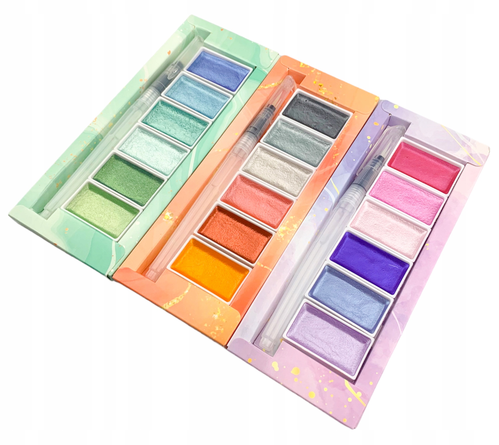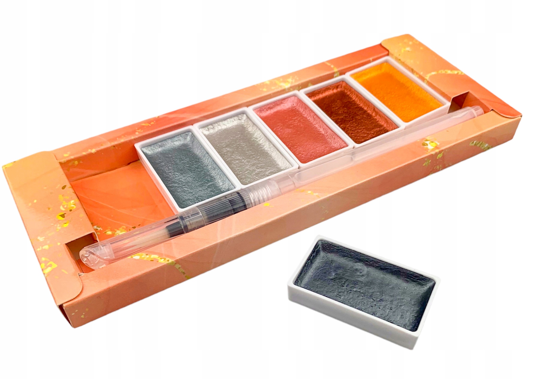 Zestaw metalicznych suchych farb akwarelowych w wodnym pędzelkiem w zestawie.