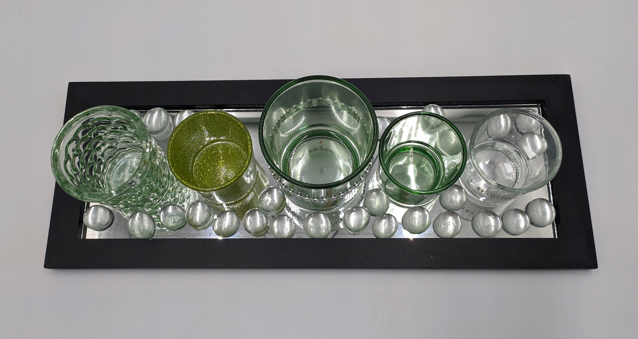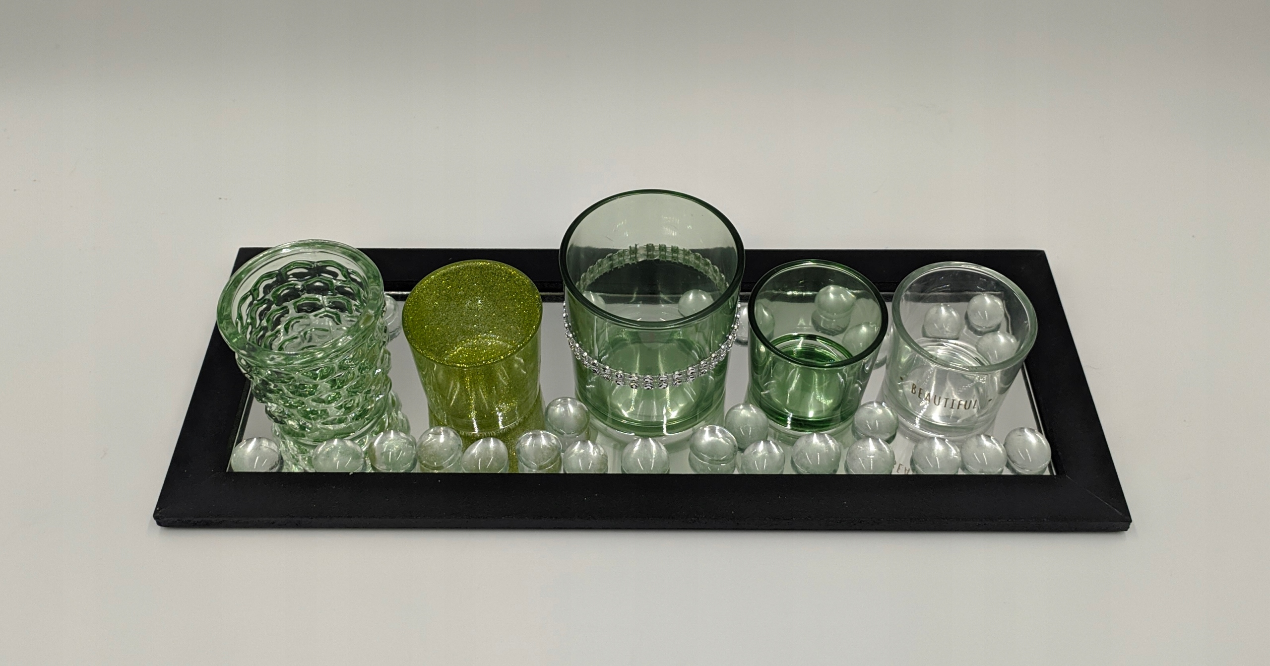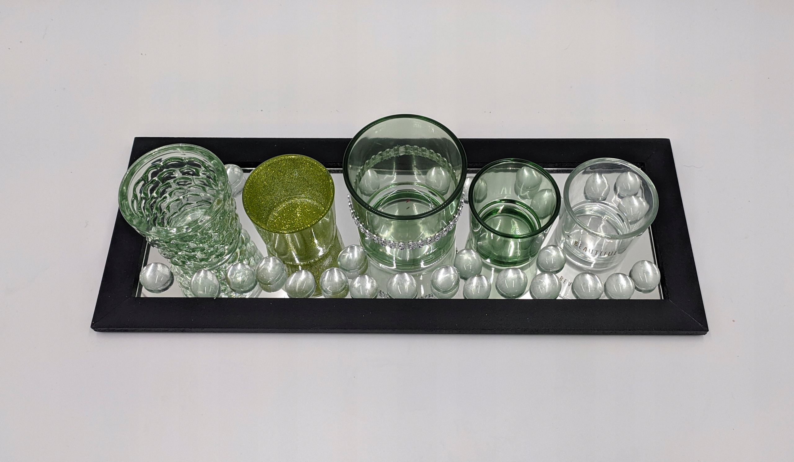 Pięć szklanych świeczników na drewnianej tacce z lustrem