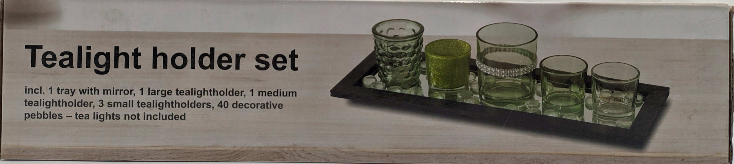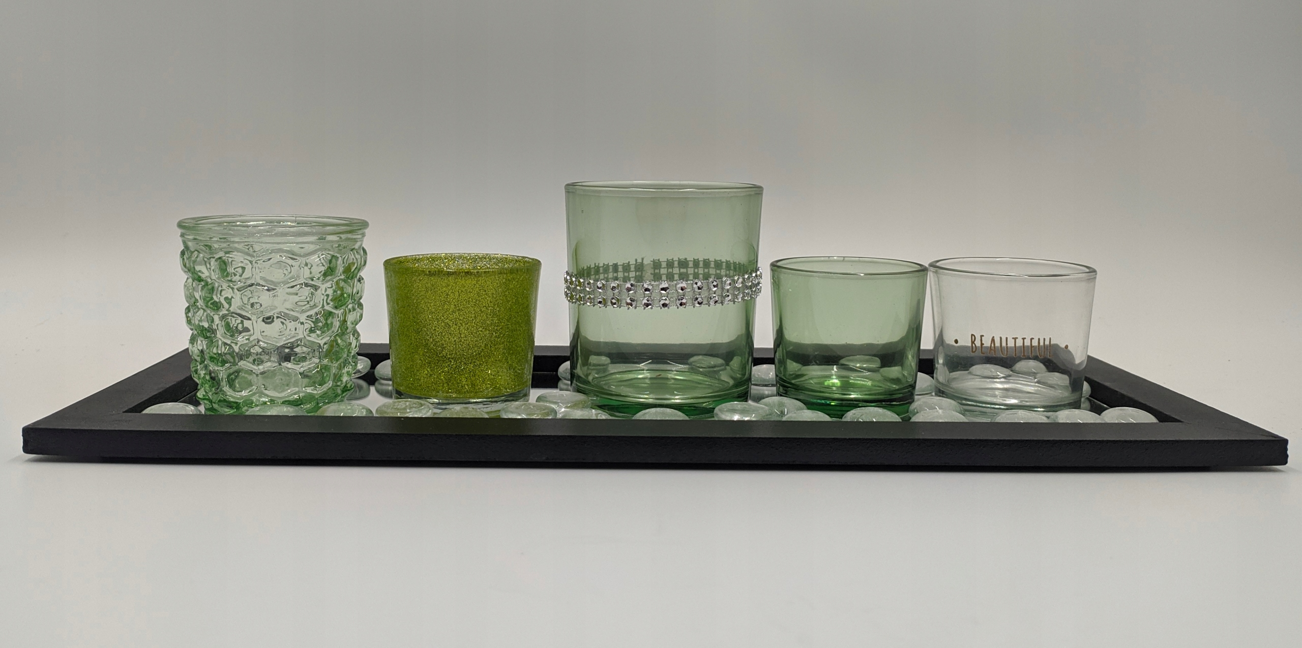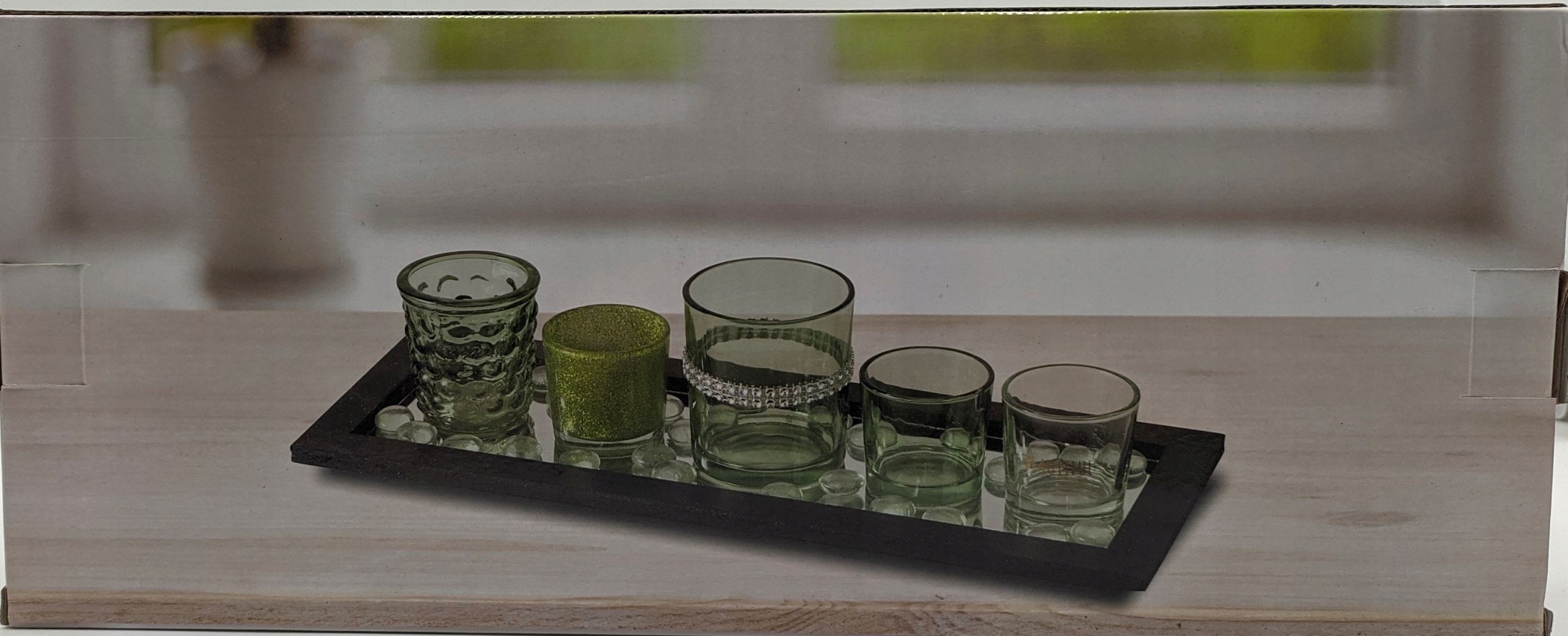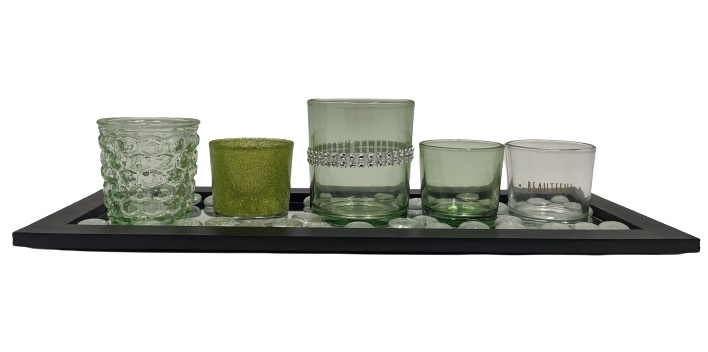 Pięć szklanych świeczników na drewnianej tacce z lustrem