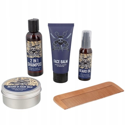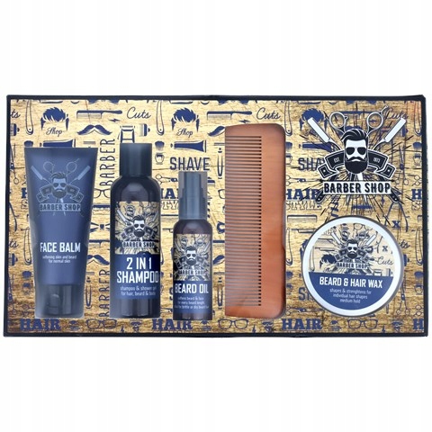 Barber Shop to zestaw czterech kosmetyków niezbędnych do utrzymania brody, włosów i twarzy w dobrej kondycji. Utrzymuje zarost czystym i dobrze odżywionym przez cały dzień. Dodatkowo nawilża skórę twarzy. Stylowe opakowanie i elegancki zapach sprawiają, iż zestaw staje się wyjątkowym prezentem dla każdego brodacza!
